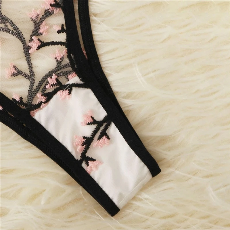 Женское кружевное нижнее белье с вышивкой, комплект из бюстгальтера с косточками и трусиков, тонкое Сетчатое прозрачное Сексуальное эротическое белье, стринги