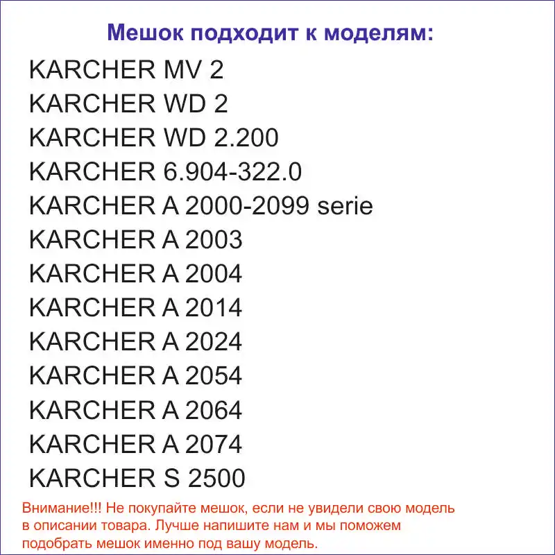 Мешок подходит к следующим моделям:KARCHER MV 2KARCHER WD 2KARCHER WD 2.200KARCHER 6.904-322.0KARCHER A 2000-2099 serieKARCHER A 2003KARCHER A 2004KARCHER A 2014KARCHER A 2024KARCHER A 2054KARCHER A 2064KARCHER A 2074KARCHER S 2500KARCHER WD 2.000-2.999 serie