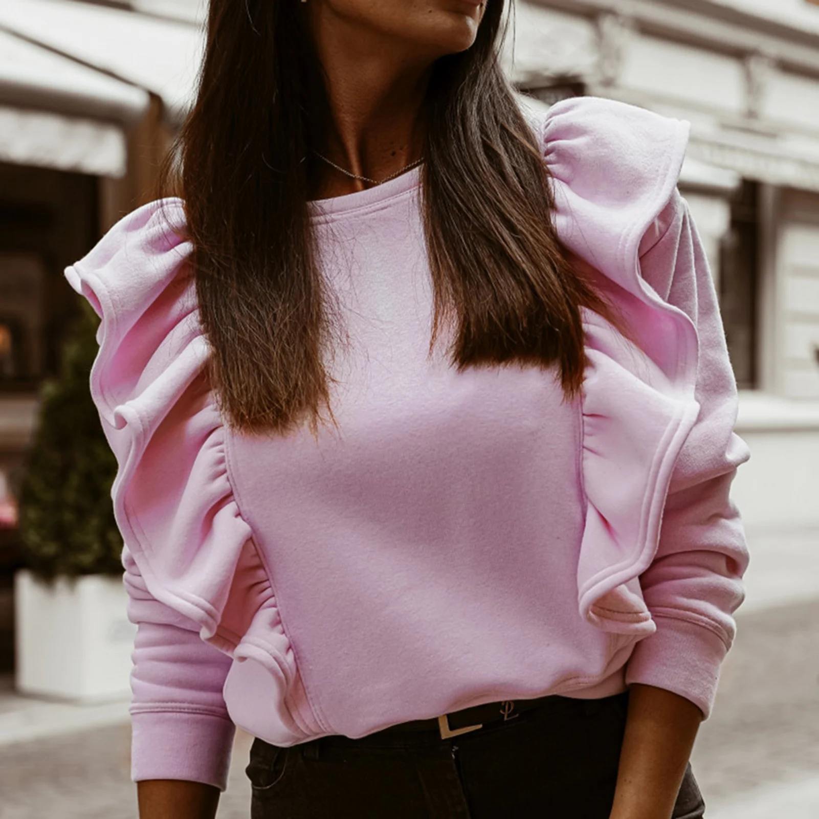 Женская блузка с длинным рукавом, круглым вырезом и оборками