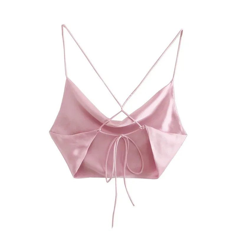 PSEEWE женский 2021 розовый атласный укороченный топ, женский летний сексуальный топ на бретельках с открытой спиной, женская пляжная одежда, майки, Майки