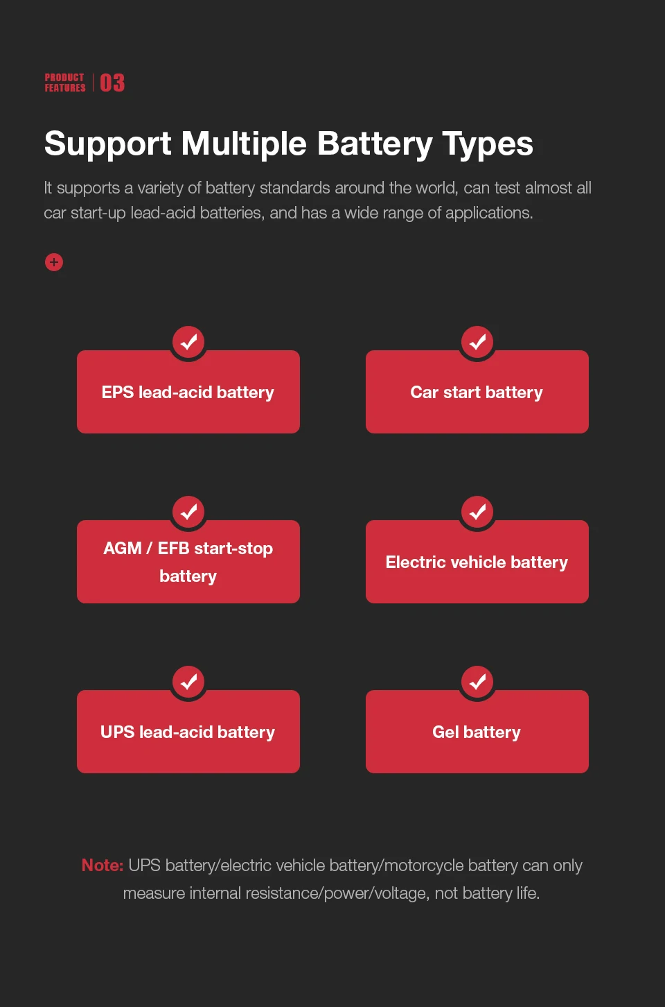 Он поддерживает различные стандарты батареи по всему миру, может протестировать почти все свинцово-кислотные аккумуляторы для запуска автомобиля и имеет широкий спектр применений.● Свинцово-кислотная батарея EPS;● Батарея запуска автомобиля;● AGM / EFB start-stopАккумулятор;● Батарея для электромобиля;● Свинцово-кислотная батарея ups;● Гелевая батареяПримечание: UPS батарея/батарея электромобиля/батарея мотоцикла может измерять только внутреннее сопротивление/мощность/напряжение, а не Срок службы батареи.