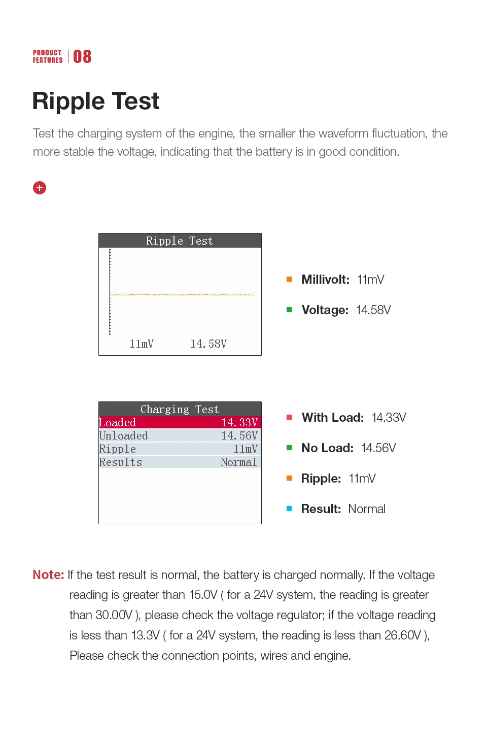 Четыре функции можно переключить по желанию, чтобы помочь вам быстро определить состояние батареи вашего автомобиля.【Тест батареи 】 срок службы/напряжение/CCA/внутреннее сопротивление【Start в Test】Battery разрядных характеристик【Нагрузочный тест 】 производительность двигателя【Тест зарядки 】 система зарядки двигателя