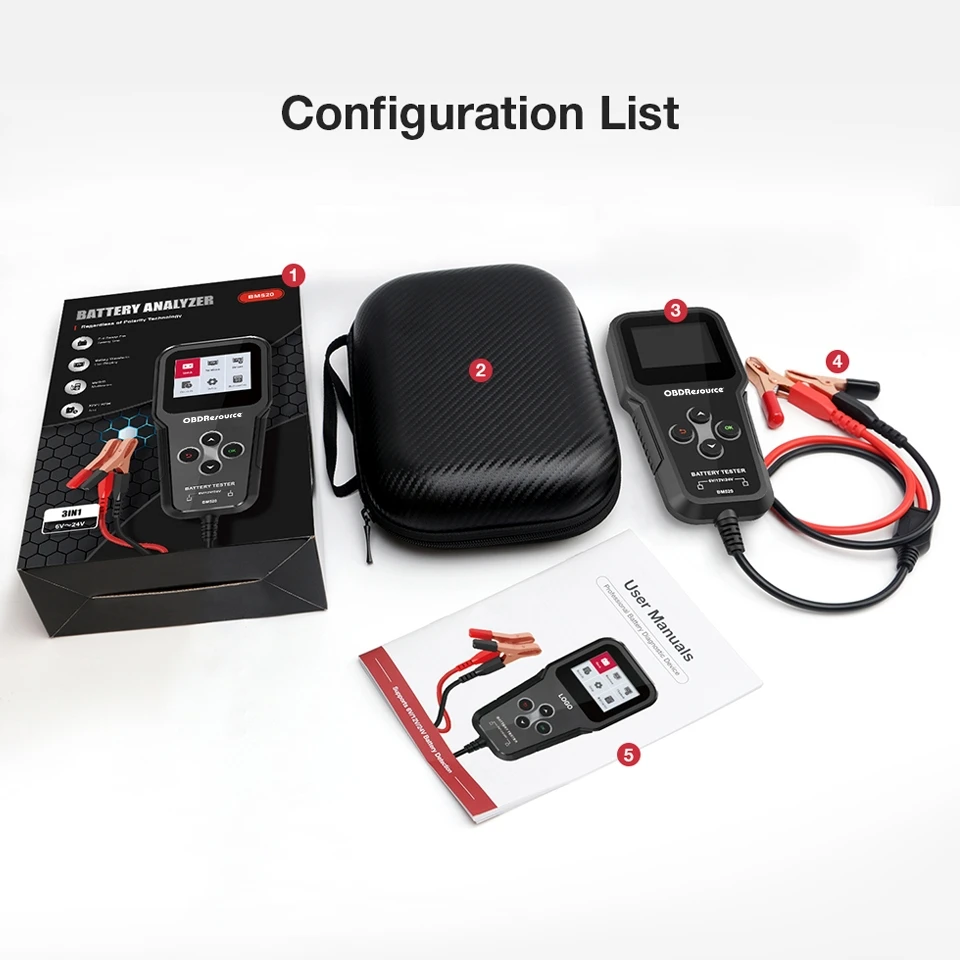 1 шт. * упаковочная коробка1 шт. * кожаная коробка1 шт. * BM520 тестер батареи с зажимом аллигатора1 шт. * Руководство пользователя на английском языке
