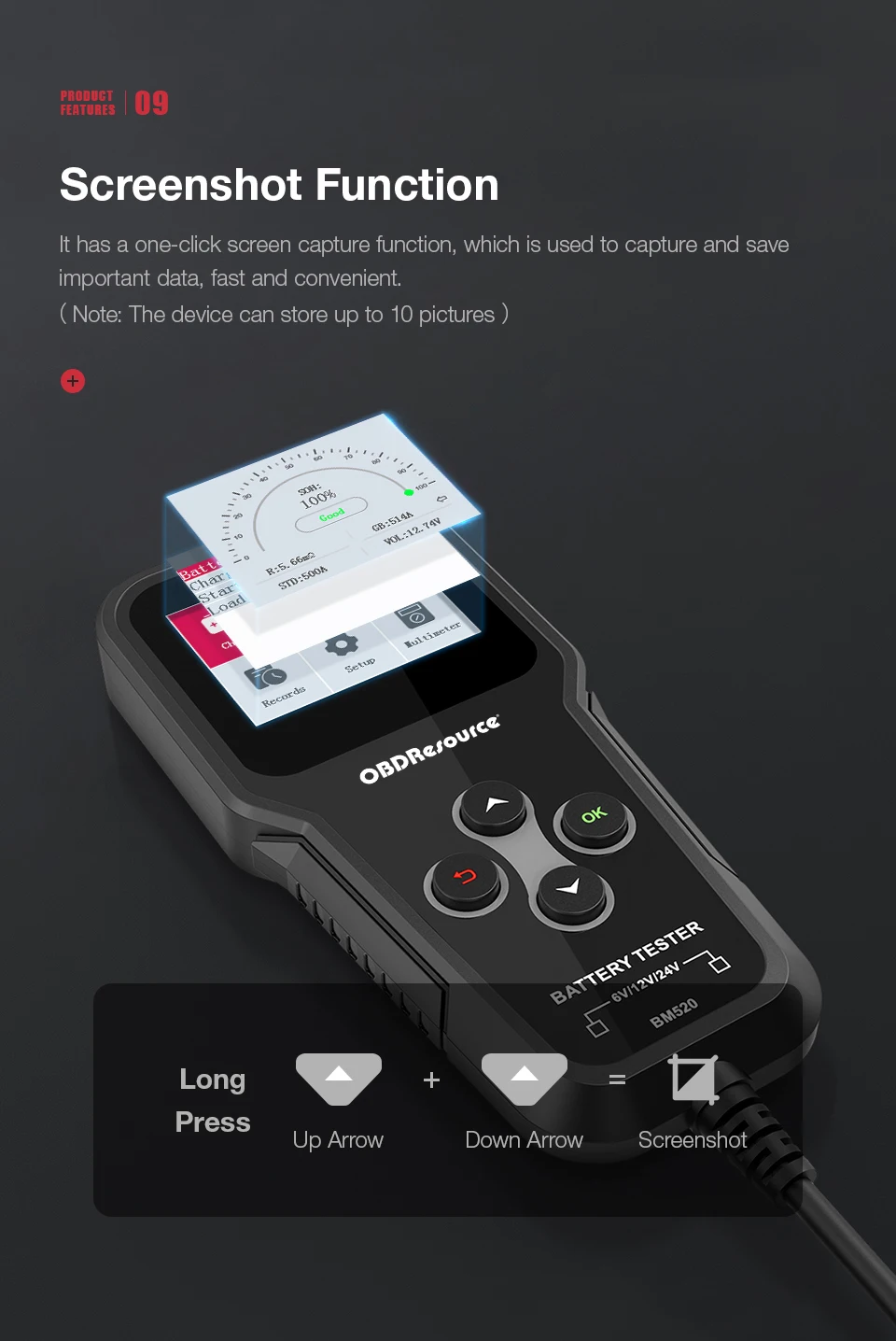 BM520 в Основном предназначен для анализа здорового состояния батареи для расчета фактического холодного сгибания, способности батареи и степени старения, которые обеспечивают надежные доказательства анализа для тестирования и обслуживания батареи. OBDResource BM520 уведомляет пользователей, чтобы заменить батарею заранее, когда батарея состарится.