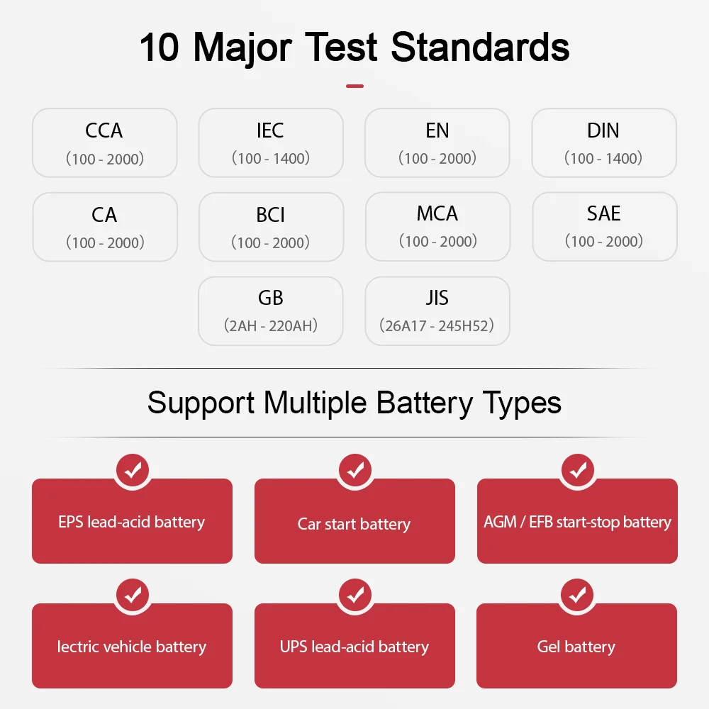 Геометрия поддерживает все текущие общие стандарты батареи, и широкий спектр тестов может удовлетворить ваши различные потребности.● Cca (100 - 2000)● IEC (100 - 1400)● En (100 - 2000)● DIN (100 - 1400)● Ca (100 - 2000)● BCI (100 - 2000)● MCA (100 - 2000)● Sae (100 - 2000)● ГБ (2ач-220ач)● Jis (26A17 - 245H52)