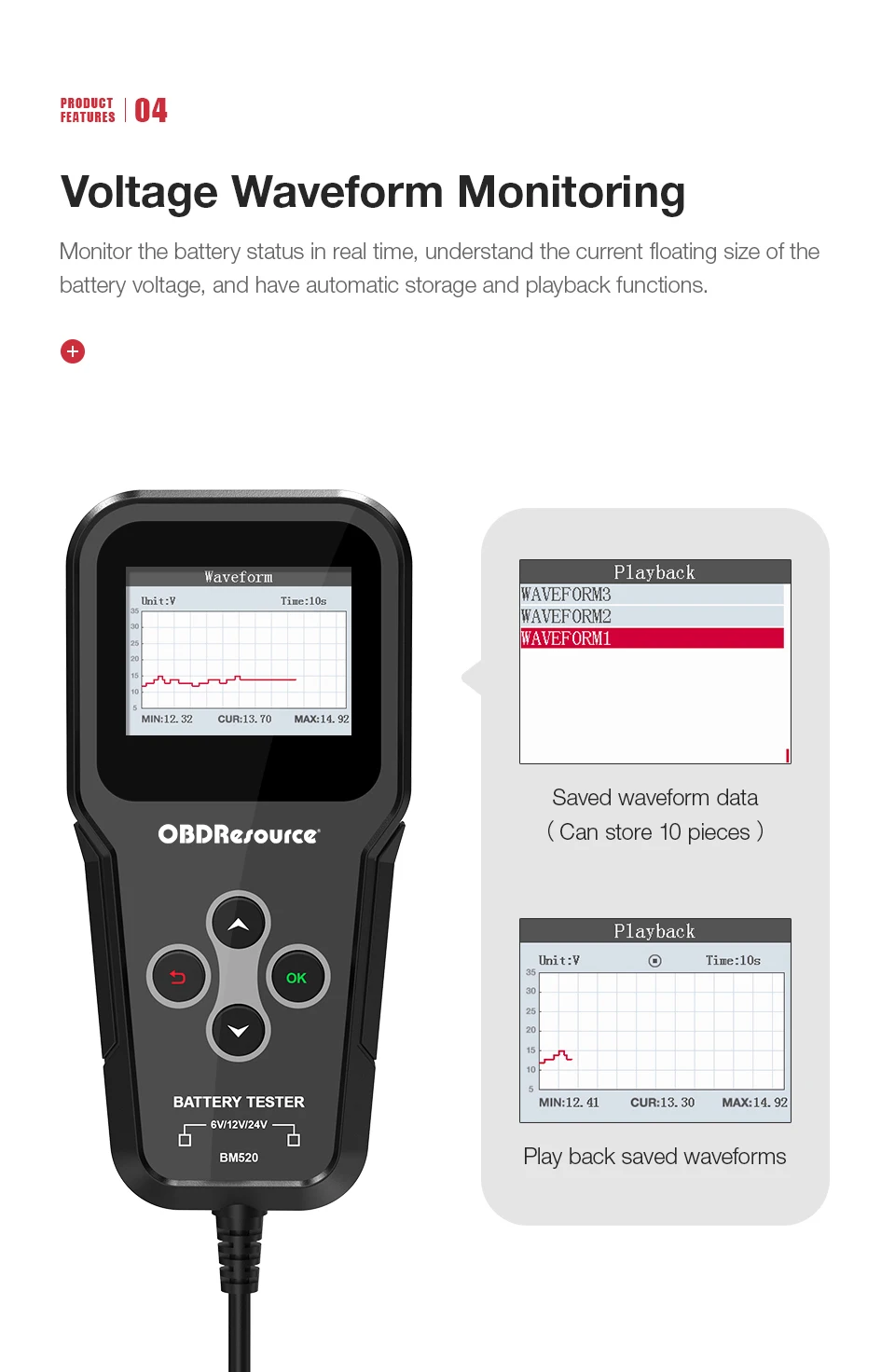BM520 в Основном предназначен для анализа здорового состояния батареи для расчета фактического холодного сгибания, способности батареи и степени старения, которые обеспечивают надежные доказательства анализа для тестирования и обслуживания батареи. OBDResource BM520 уведомляет пользователей, чтобы заменить батарею заранее, когда батарея состарится.
