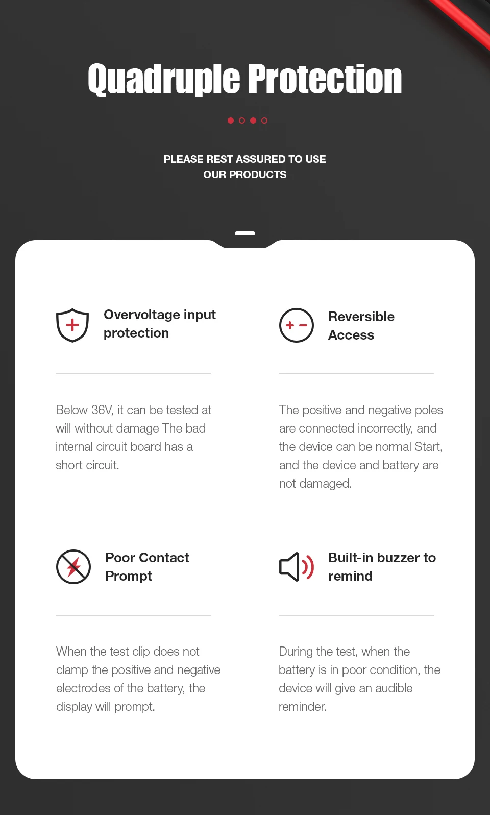 【Защита входного сигнала overvolatge ниже 36 В, он может быть протестирован по желанию без повреждения плохой внутренней монтажной платы имеет короткое замыкание.【Двусторонние аксессуары 】положительные и отрицательные полюсы подключены неправильно, и устройство может быть нормальным запуском, устройство и аккумулятор не повреждены.【Плохой контакт prompt】когда тестовый зажим Не зажимает положительные и отрицательные электроды тестера, дисплей подскажет.【 Встроенный звуковой сигнал, чтобы напомнить во время теста, когда батарея находится в плохом состоянии, устройство даст звуковое напоминание.