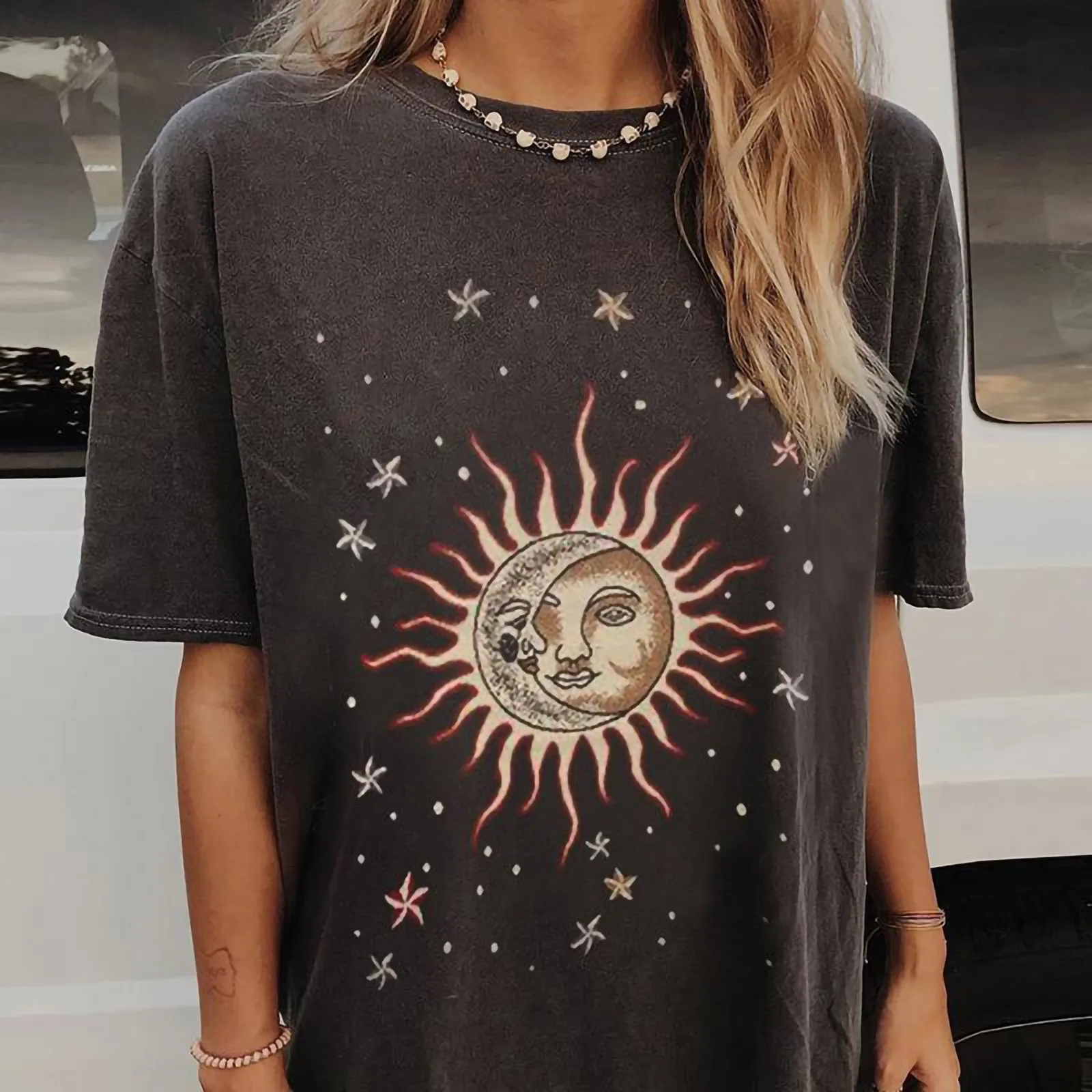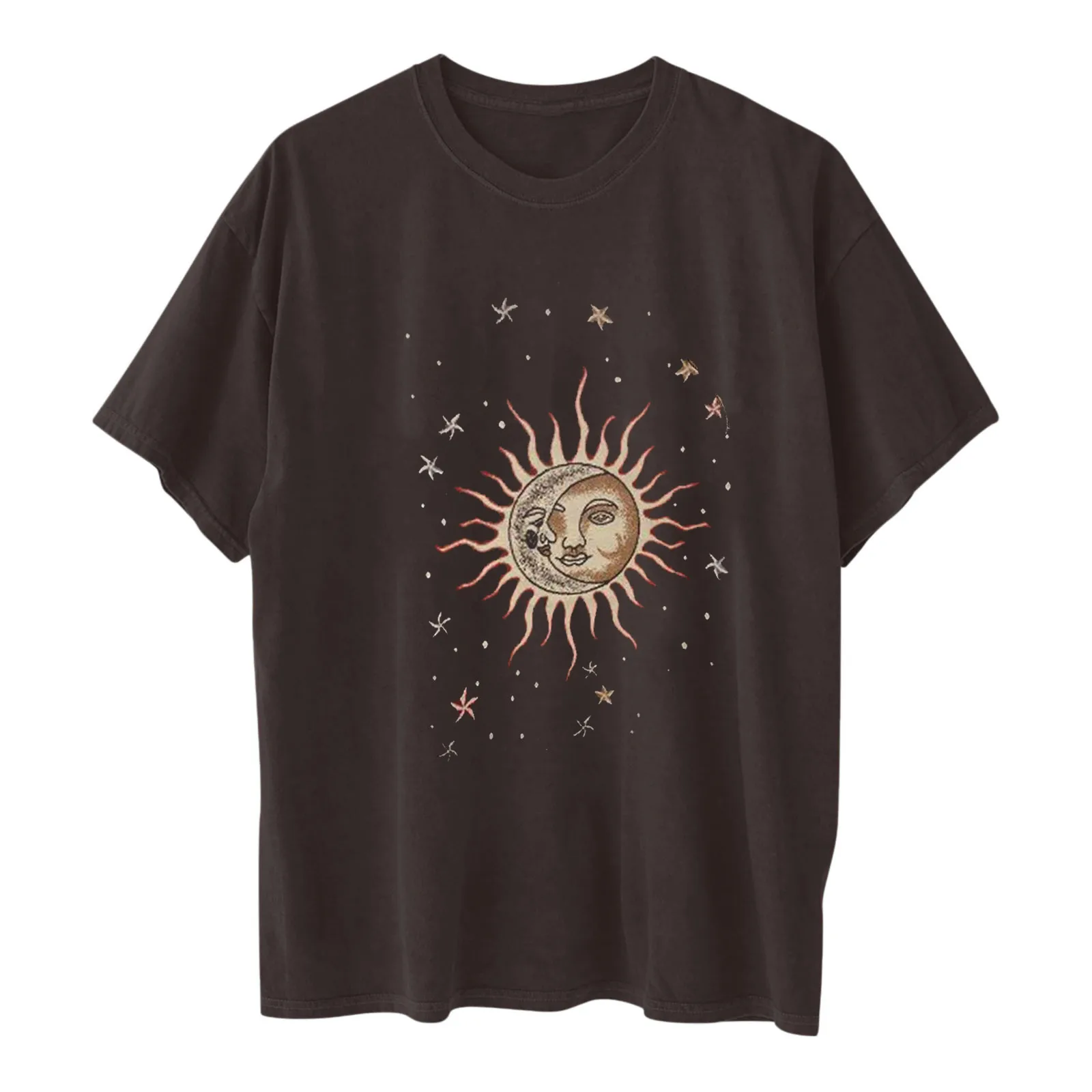 Футболка женская оверсайз с принтом солнце-Луна, винтажный топ с коротким рукавом и круглым вырезом, повседневная одежда в стиле Харадзюку, 40 #