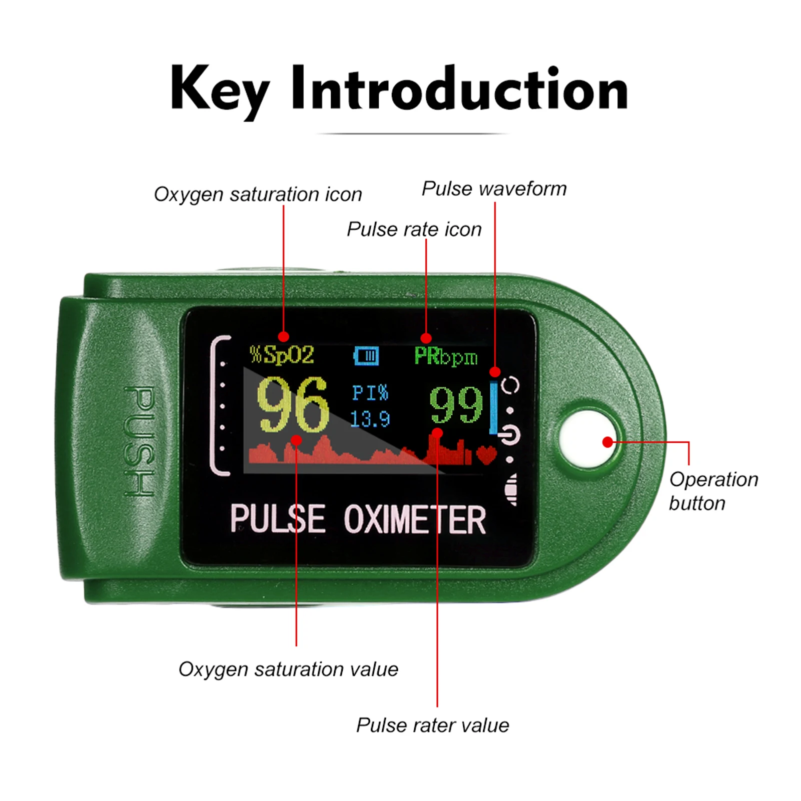 Пожалуйста, обратите внимание, что указанный Товар производится и распространен за рубежом и в соответствии с законодательством страны его происхождения.Пальцевой Пульсоксиметр является экономичным и точным методом для обнаружения пульса и насыщения крови кислородом пальцем. Маленький размер, легко носить с собой. Подходит для ежедневного использования, измерения Вашего здоровья в любое время.Особенности:Мути-Функция: цифровой Пульсоксиметр может быть использован для измерения частоты пульса, уровня насыщения кислорода в крови точно.Легко читается: Поддержка SPO2, импульсной И БАРНОЙ диаграммы, вы можете просматривать свой результат очень ясно с tft-дисплеем.Простота в использовании: Точная и надежная, одна кнопка работы, Просто прикрепите его к пальцу и включите его при нажатии кнопки. Автоматическое выключение После 5s, когда не используется.Широко применяется: подходит для повседневного использования. Широко используется в семье, на открытом воздухе, в спорте и т. Д.Компактный размер: оксиметр легкий и портативный.Характеристики:Цвет: зеленый, синий, черный (опционально)Материал: пластикЭкран: TFT дисплейИзмерение уровня кислорода в крови точность: 70 ~ 100%, ± 2%, менее 70% не определенИзмерение уровня кислорода в крови диапазон: 0 ~ 100% (разрешение составляет 1%)Диапазон измерения пульса: 30 ~ 250BPM (разрешение-1BPM)Автоматическое выключение: когда палец не вставлен, он автоматически отключится в течение 5 секундБатарея: 2 * батарейки типа "ААА" (не входит в комплект)Размер посылка: 85*65*40 мм/3,3*2,6*1,6 дюймовПосылка Вес: 40 г/1,4 ozУпаковочный лист:1 х оксиметр1 x ремешок1 x Руководство пользователя