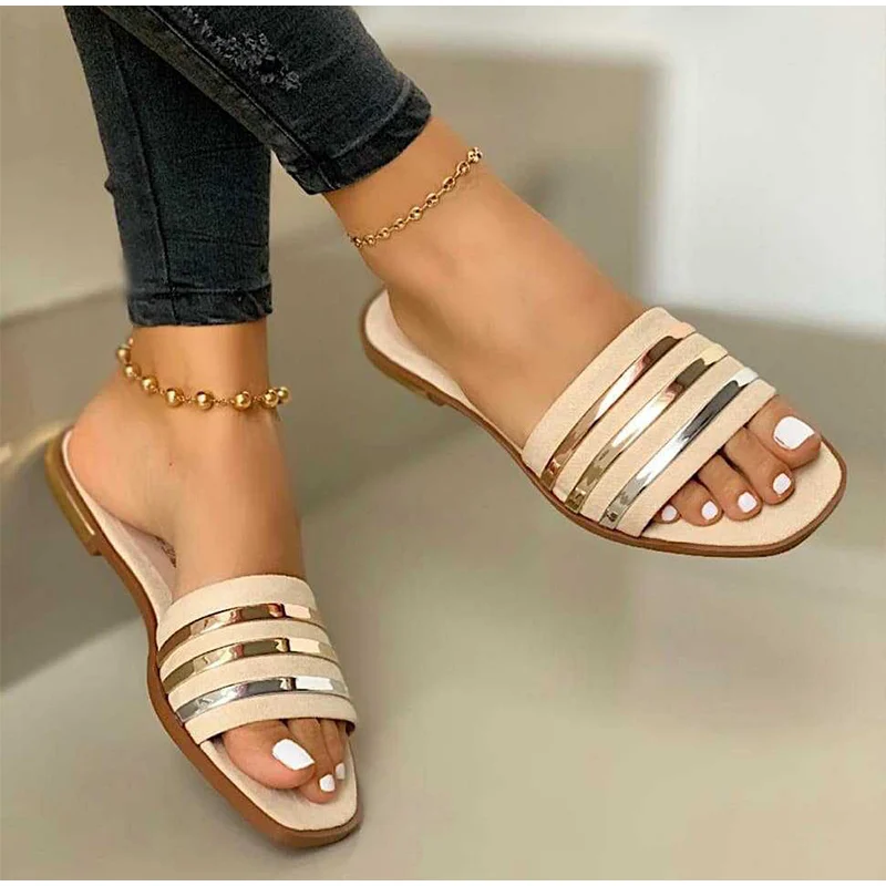 Женские пляжные шлепанцы, сланцы, плоская подошва, без застежки, повседневные сандалии, размера плюс, золотистые, лето 2021