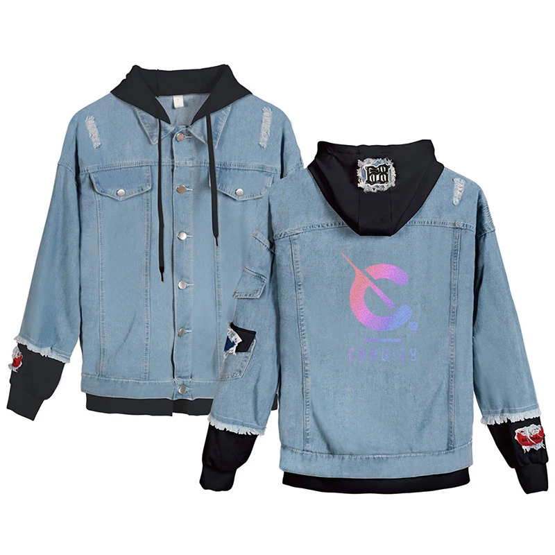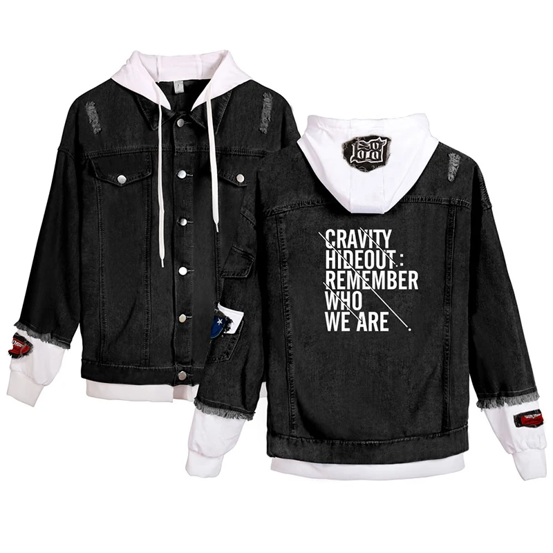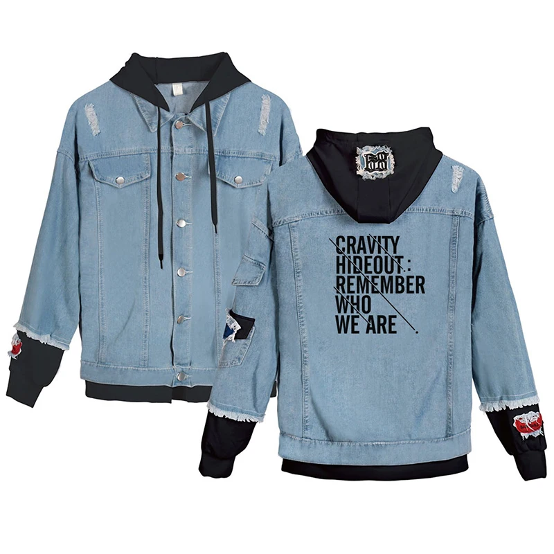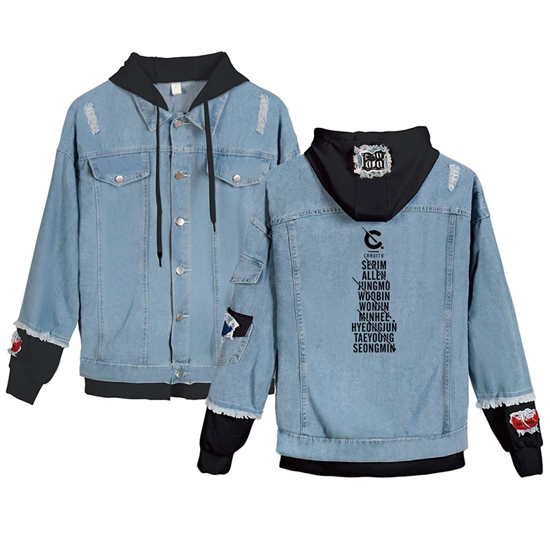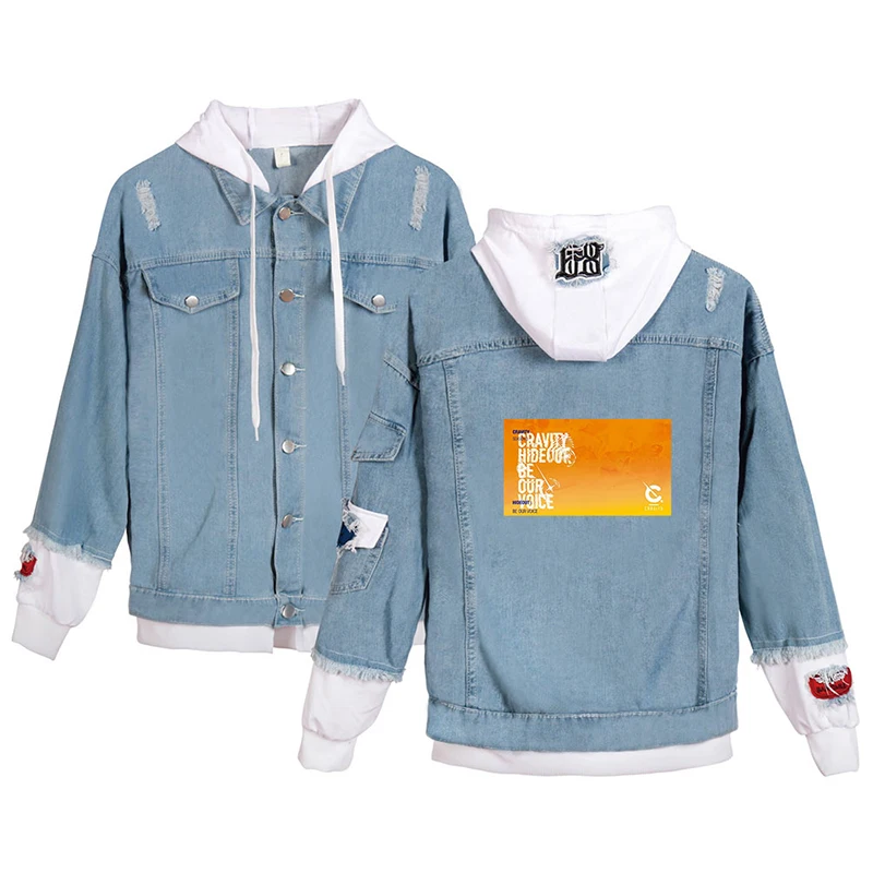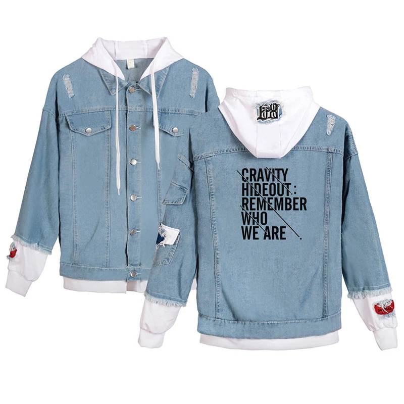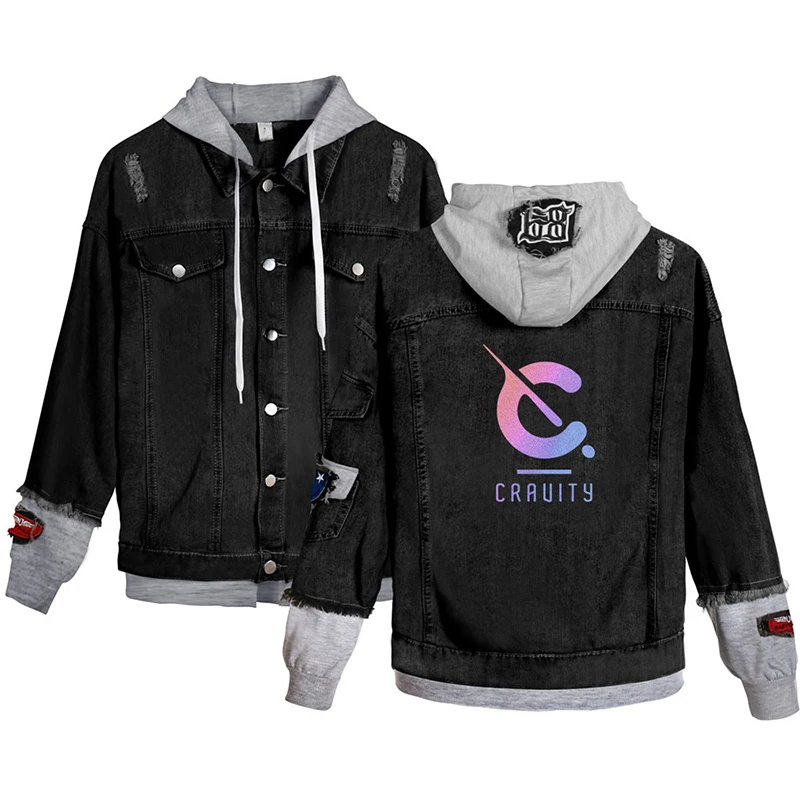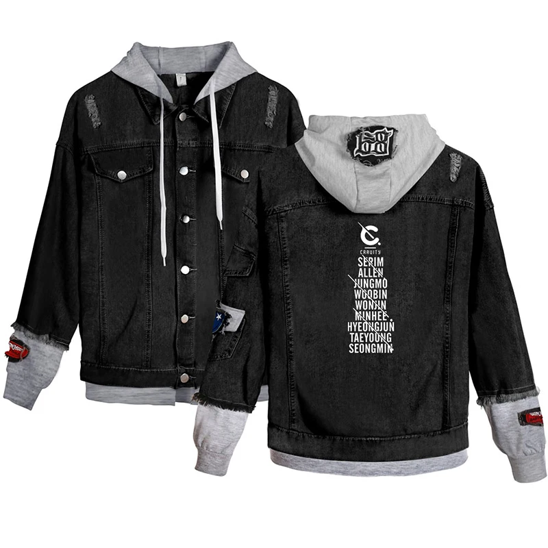 Мужская и женская джинсовая куртка с длинным рукавом CRAVITY Kpop, имитация двух предметов в Корейском стиле, Стильная джинсовая куртка в стиле хип-хоп с капюшоном, уличная одежда