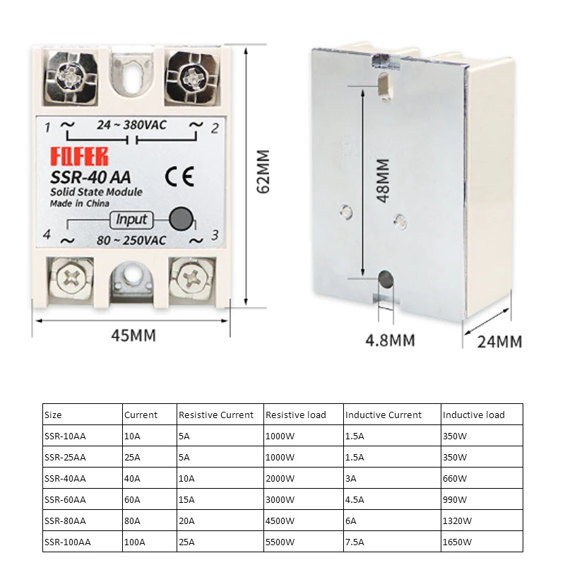 Однофазный твердотельный релейный модуль SSR-40AA, 10AA, 25AA, 60AA...