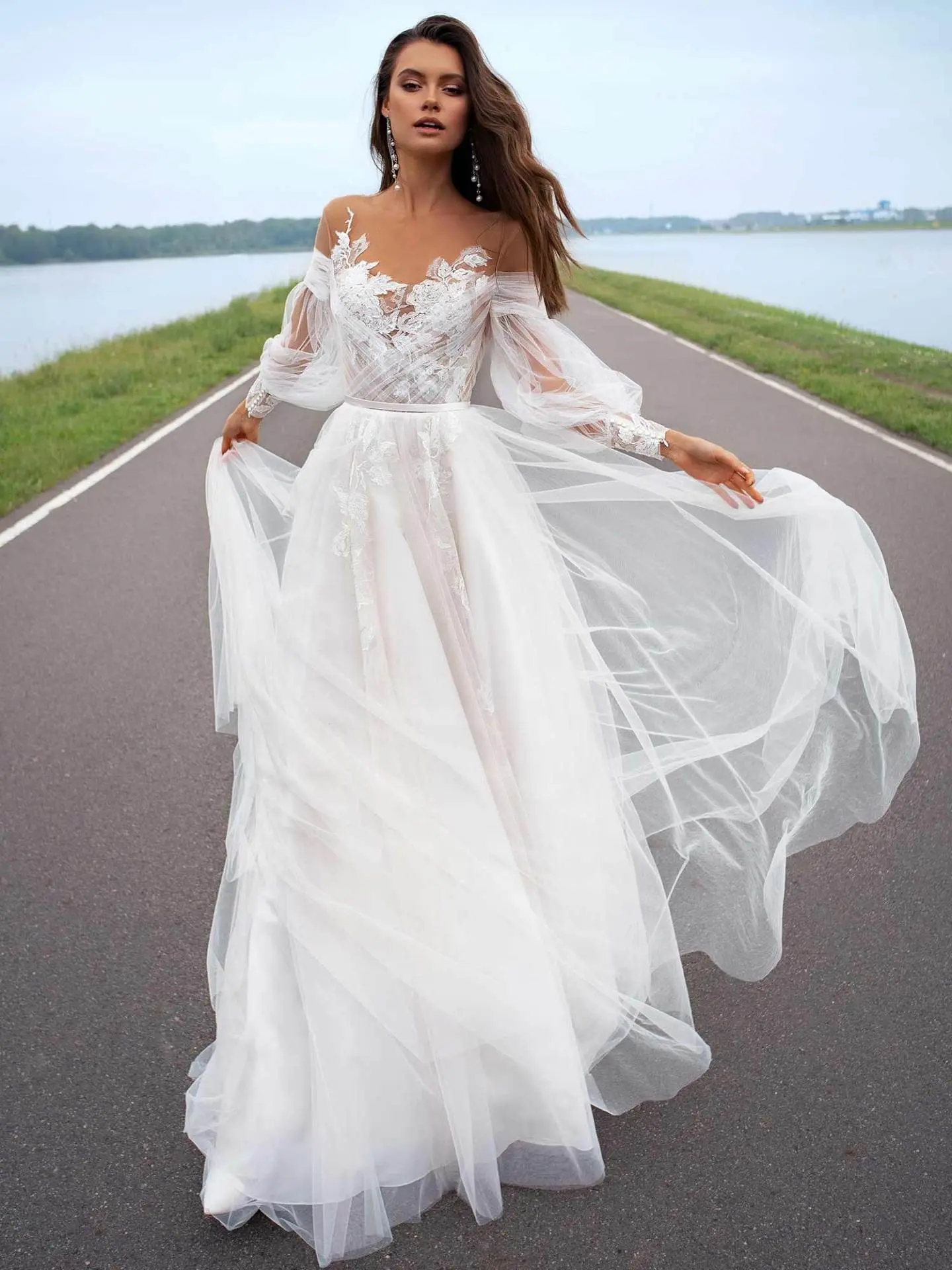 Женское свадебное платье с длинным рукавом, кружевное платье с аппл...
