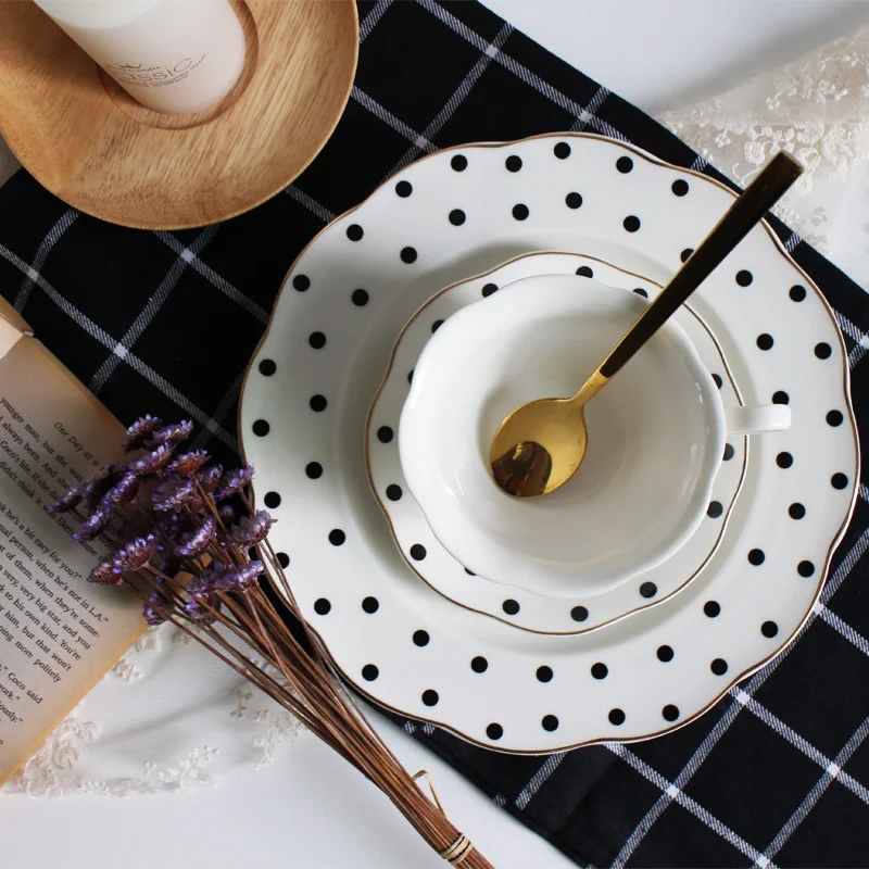 Черно-белая винтажная тарелка для завтрака в стиле Хепберн, керамическая посуда в полоску с волнистыми точками