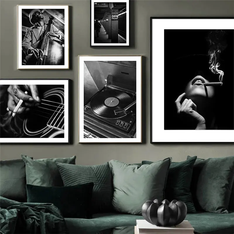 Черно-белый настенный плакат с принтом гитары, джаза, музыки, портрет, холст, живопись настенные картины для гостиной, домашнего декора