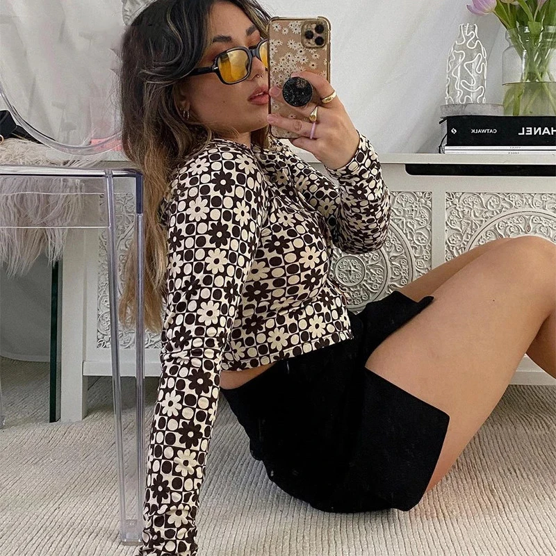 Кроп-топ y2k женский с длинным рукавом, коричневый винтажный Повседневный пикантный базовый модный топ с v-образным вырезом, 90-х годов, весна-лето