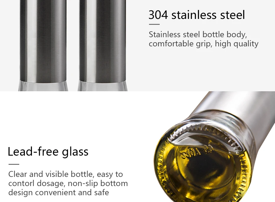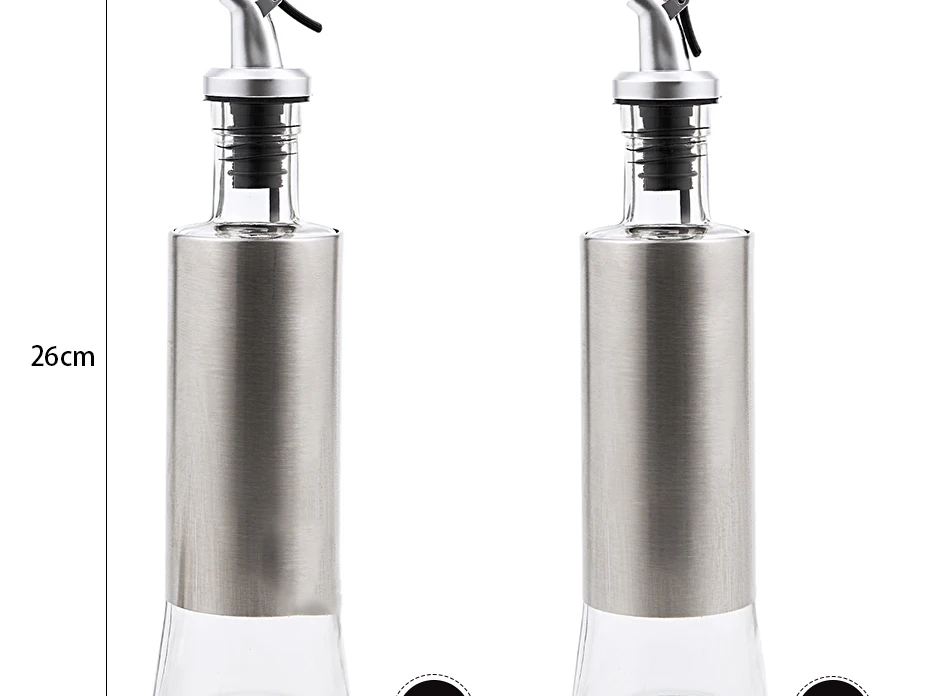 Материал: нержавеющая сталь, бессвинцовое стекло, ABS Размер: 26 см * 6,6 см Емкость: 300 мл Применение: масло, уксус, соевый соус, вино ..