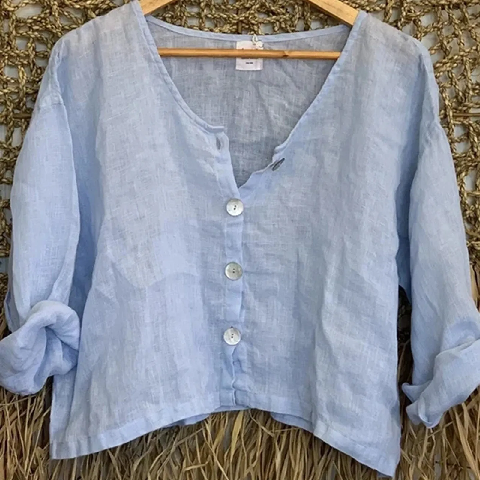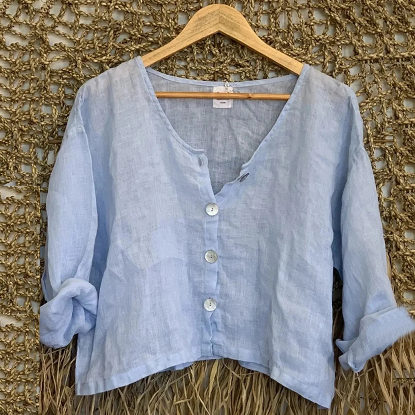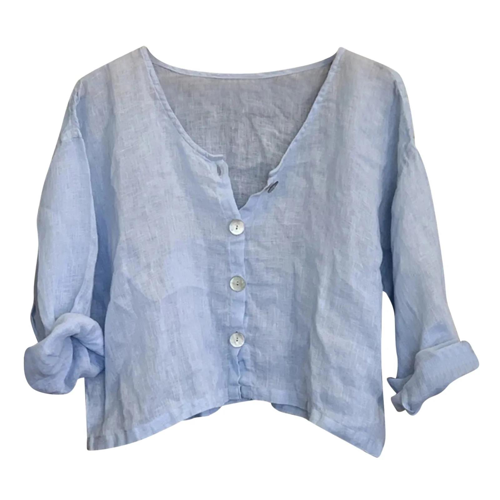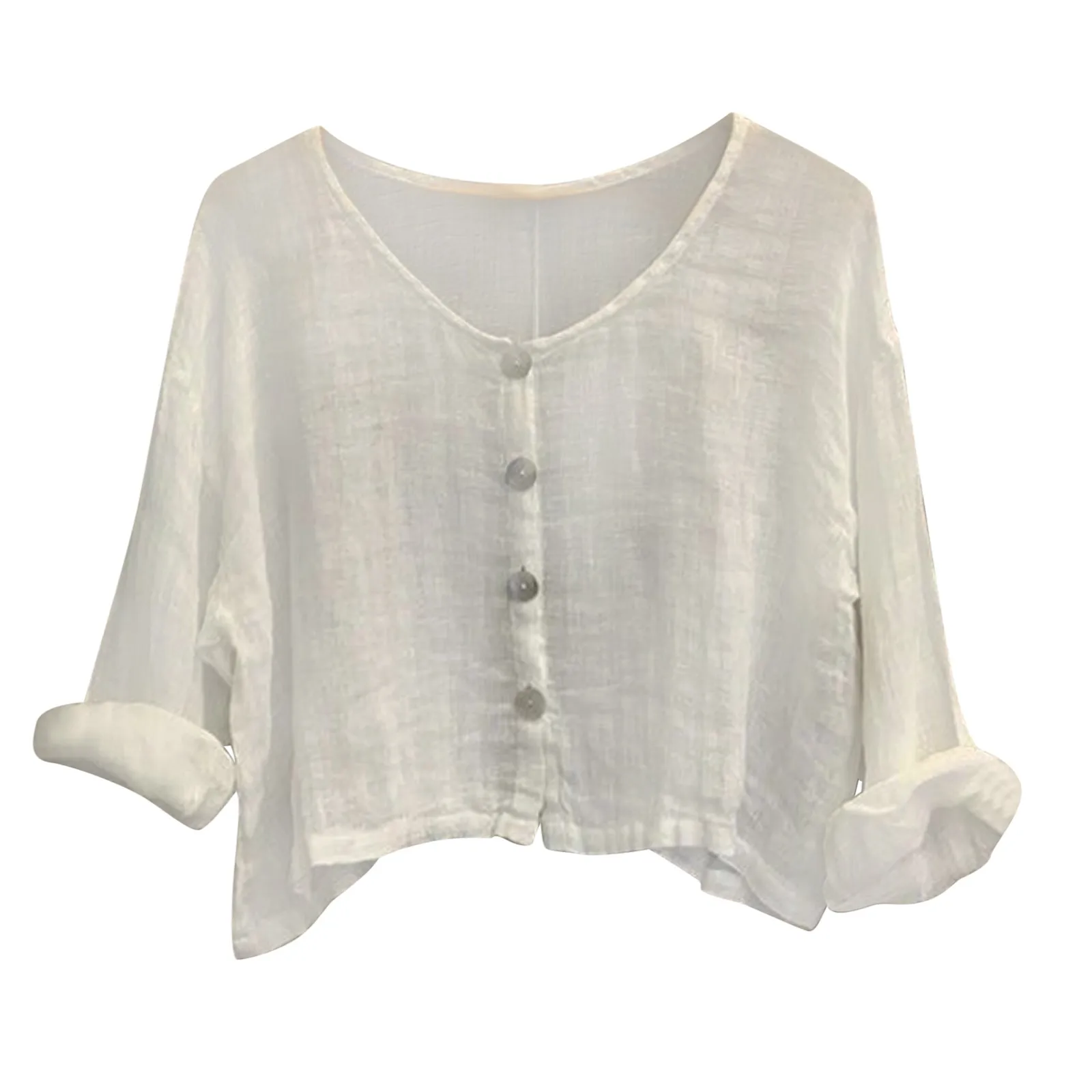 Рубашка женская на пуговицах, Повседневная Мягкая однотонная блузка с длинным рукавом, V-образным вырезом, винтажная Классическая льняная тонкая свободная короткая свободные топы