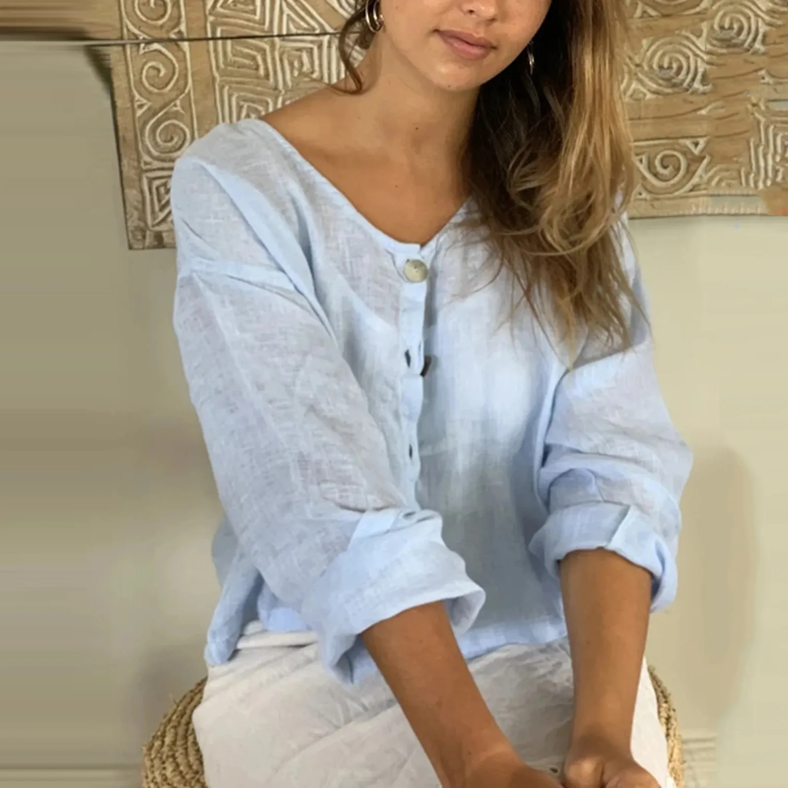 Женская Повседневная однотонная блузка на пуговицах с длинным рукавом и V-образным вырезом, тонкие льняные свободные топы