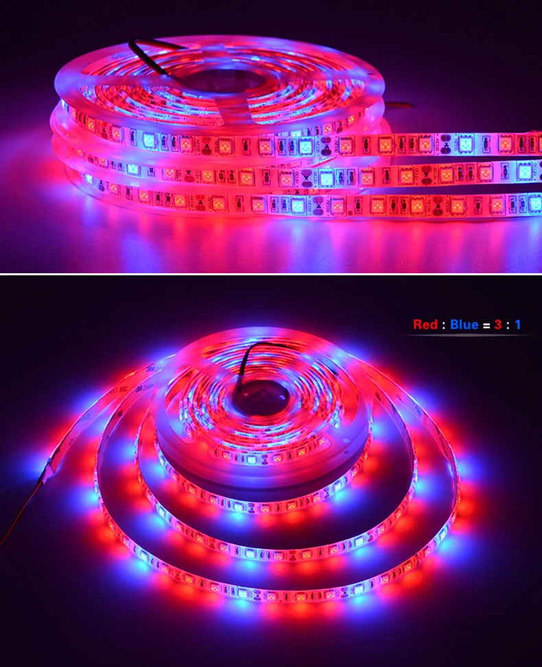 Светодиодный ленточный светильник Технические характеристики:Тип: светодиодный светильник для выращивания растенийВодонепроницаемость: IP65 / IP20Тип светодиодный: SMD 5050Количество светодиодов: 60 светодиодов/мСветящиеся Цвета: красный и синий (красный: синий = 3:1 или 4:1 или 5:1)Светодиодный Длина волны: Красный: 660нм; Синий: 450нмНапряжение: 12 В постоянного токаДлина: 5 мОбратите внимание:Светодиодный светильник-полоски посылка не содержит каких-либо принадлежностей, таких как светодиодный контроллер, DC или USB адаптер питания и т. Д.Влияние спектрального диапазона на физиологию растений:280nm-315nm оказывает минимальное влияние на морфологию и физиологические процессыХлорофилл от 315нм до 420нм поглощает меньше эффекта фотофериода и предотвращает удлинение стволаКоэффициент поглощения хлорофилла и каротиноидов на 420 нм до 500 нм (синий) является крупнейшим и оказывает самое большое влияние на фотосинтезСкорость поглощения красителя 500nm-620nm не высокаяСкорость поглощения хлорофилла 620нм? 9? 1750 нм (красный) является «высоким», что оказывает значительное влияние на фотосинтез и фотоэффектСкорость поглощения 750nm-1000nm, стимулирует удлинение клеток, влияет на цветение и прорастание семян> 1000 нм преобразуется в калории