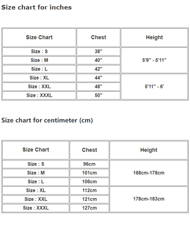 Размер: XXL 48" Размер: XXXL 50"Таблица размеров для сантиметра (см)