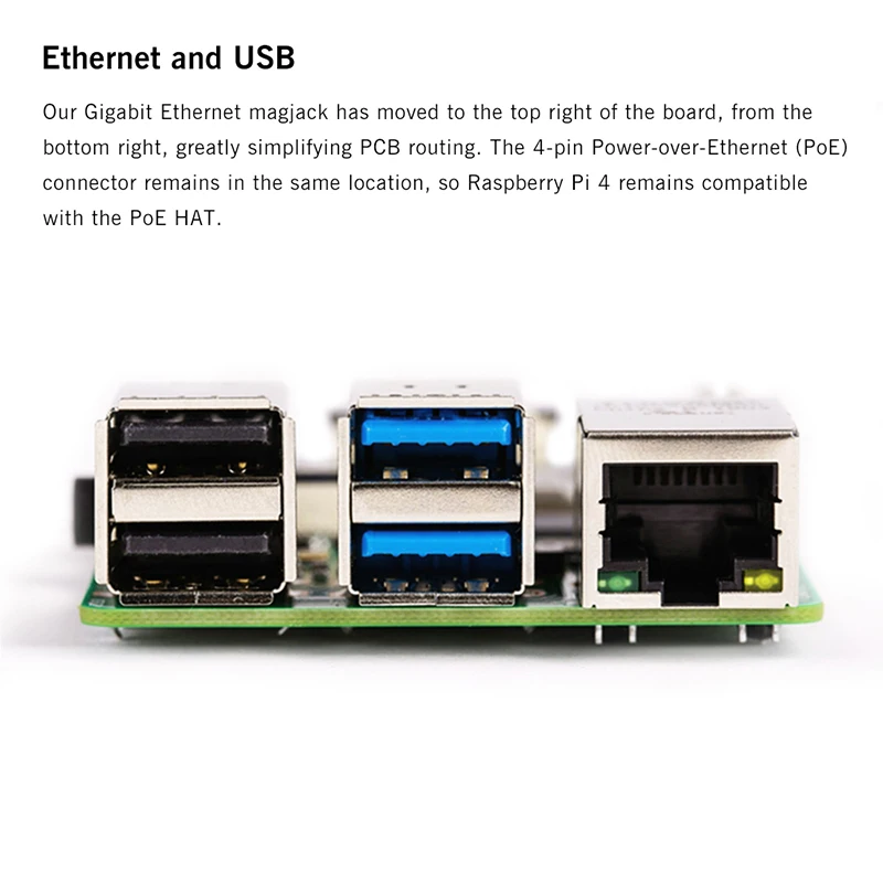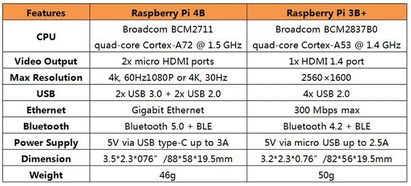 Broadcom BCM2711, Quad core Cortex-A72 (ARM v8), 64-разрядная SoC 1,5 ГГц1 Гб, 2 Гб или 4 Гб LPDDR4-2400 SDRAM (в зависимости от модели)2,4 ГГц и 5,0 ГГц IEEE 802.11ac беспроводной, Bluetooth 5,0, BLEГигабитный Ethernet2 порта USB 3,0; 2 порта USB 2,0.Raspberry Pi standard 40 pin GPIO header (полностью совместим с предыдущими платами)2 × порты micro-HDMI (поддержка до 4kp60)2-lane MIPI DSI порт дисплея2-lane MIPI CSI камера порт4-полюсный стерео аудио и композитный видеопортH.265 (4kp60 decode), H264 (1080p60 decode, 1080p30 encode)Графика OpenGL ES 3,0Слот для карт Micro-SD для загрузки операционной системы и хранения данных5 в постоянного тока через USB-C разъем (минимум 3A *)5 в постоянного тока через GPIO header (минимум 3A *)Включение питания через Ethernet (PoE) (требуется отдельная шляпа PoE)Рабочая температура: 0 - 50 градусов C окружающей среды