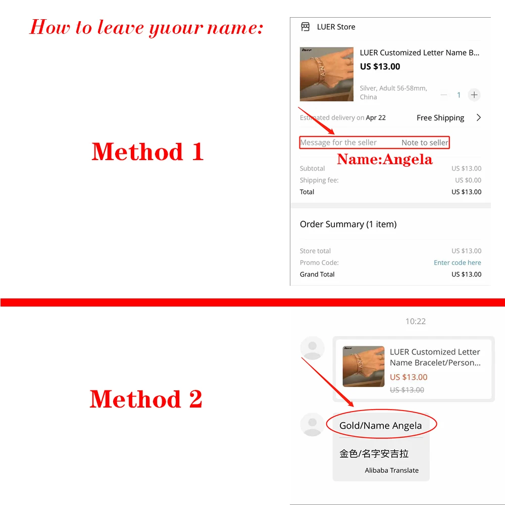 1. Пожалуйста, оставьте имя или буквы в поле для комментариев или свяжитесь с продавцом.