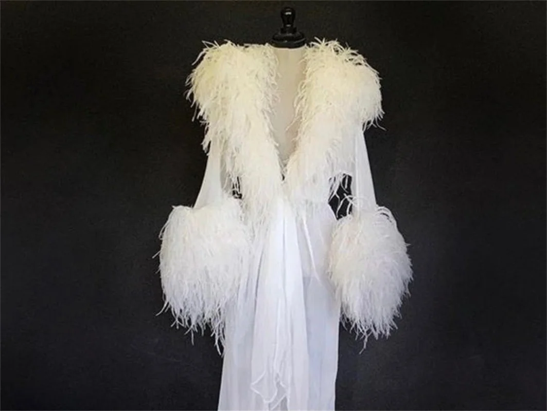 Халат женский с страусиными перьями, длинный тюлевый банный халат, свадебная ночная рубашка, белого цвета, иллюзия