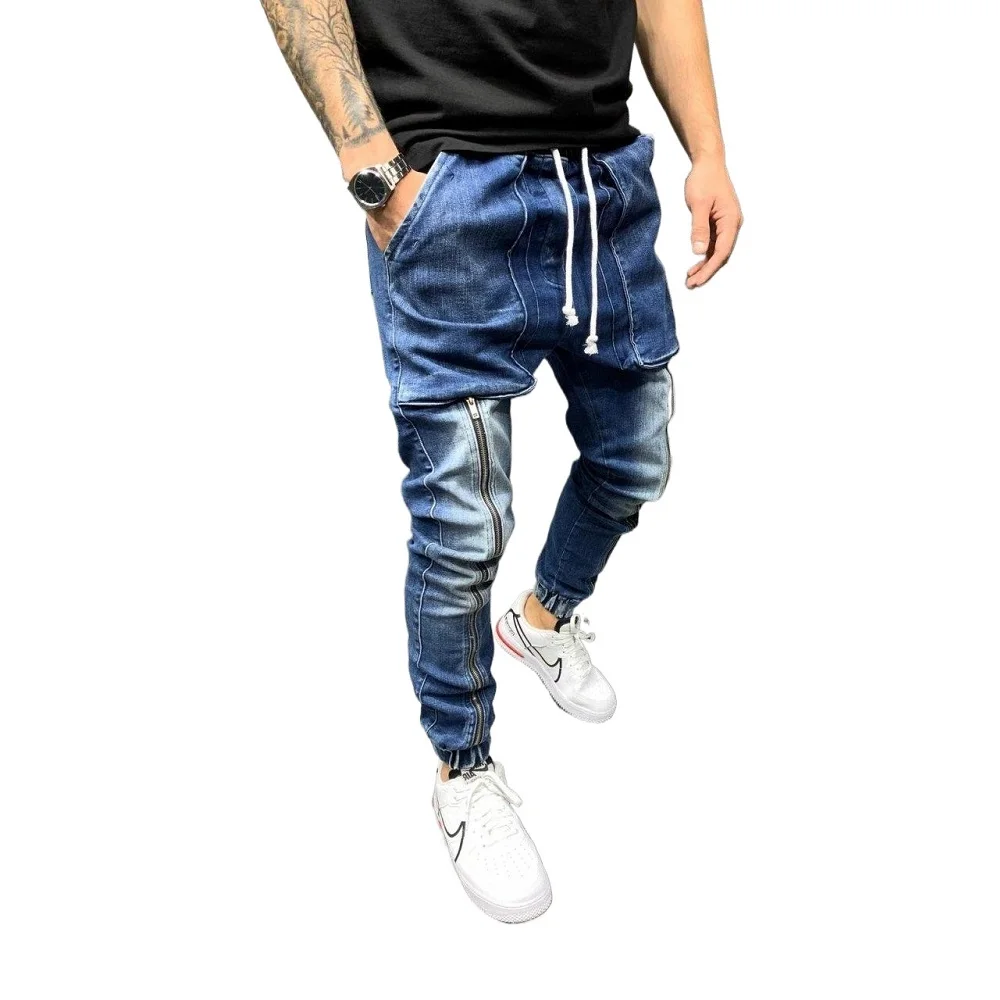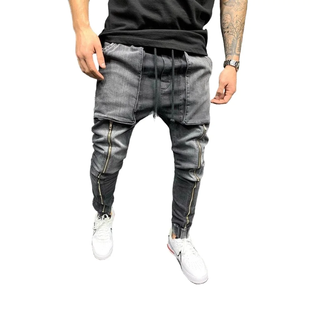 Джинсы со шнурком для мужчин, повседневные спортивные брюки-карандаш на молнии с большими карманами
