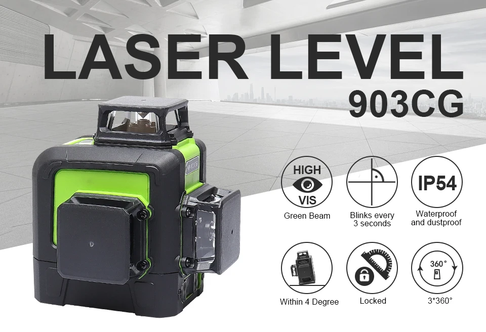 В903CG лазер-это перекрестный лазерный уровень. Это устройство само-выравнивается с диапазоном точности в пределах ± 4 °. Рабочий диапазон этого лазера составляет до 45 м в зависимости от освещения рабочей зоны.