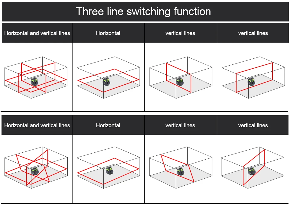 Как переключить линию:После включения питания кратковременно нажмите на выключатель питания, лазерный инструмент по очереди проецирует горизонтальную, вертикальную и поперечную линии.