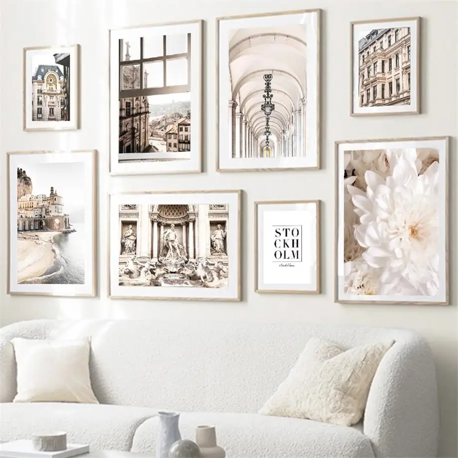 Настенные картины с изображением башни Парижа, берега Амальфи, чайк...
