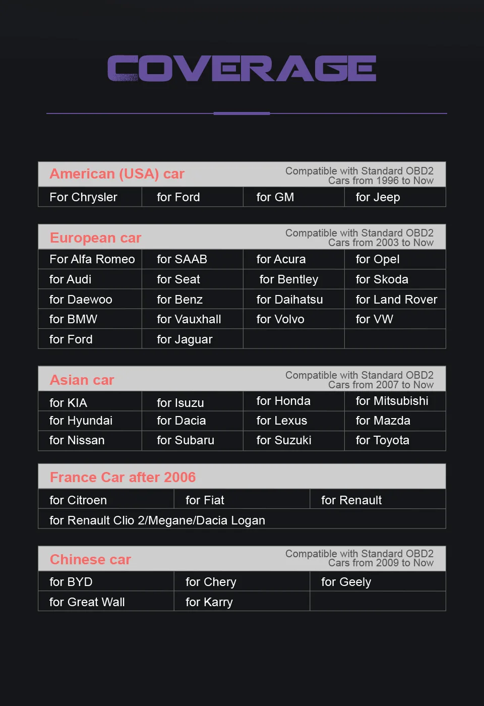 Совместимость со стандартными OBD2 автомобилями с 2009 года по настоящее время: для BYD, для Chery, для Geely, для Great Wall, для Karry