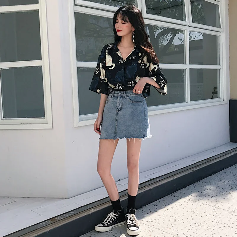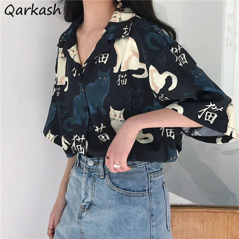 Блузка женская в японском стиле, шикарная свободная популярная уличная одежда в китайском стиле, Базовая рубашка с винтажным принтом кошки, топ для колледжа