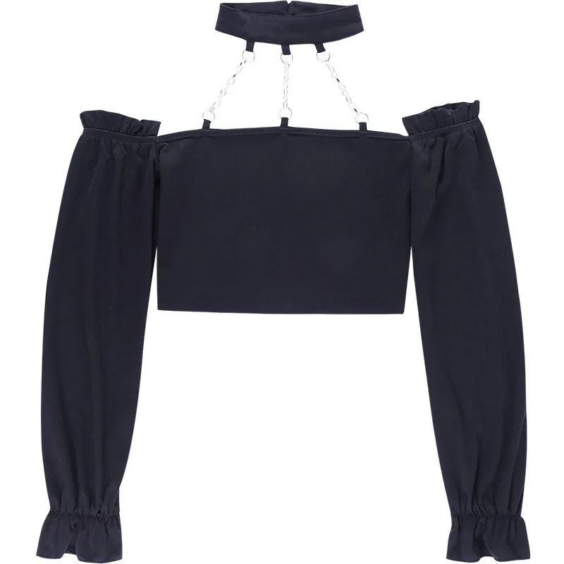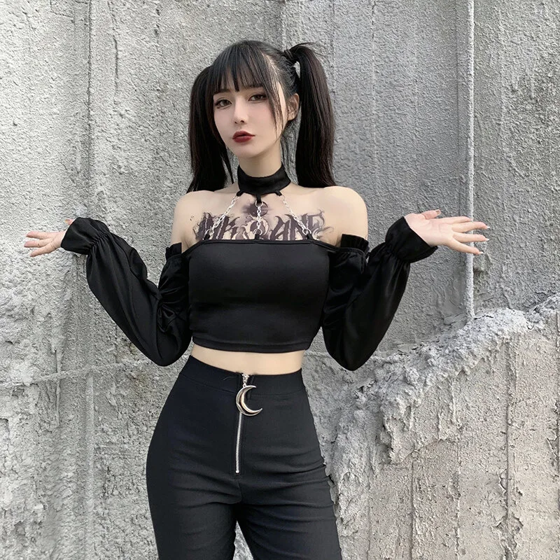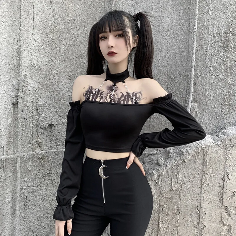 Женская блузка с открытой спиной, черная блузка с длинным рукавом и цепочкой, в готическом стиле