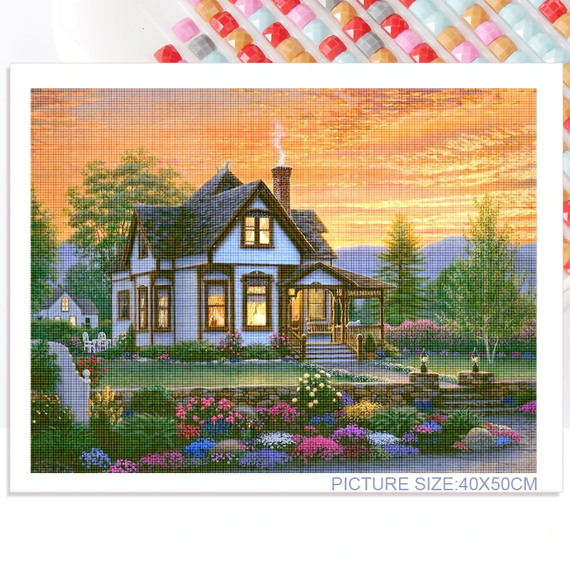 Вышивка крестиком с изображением сказочного города, пейзажа