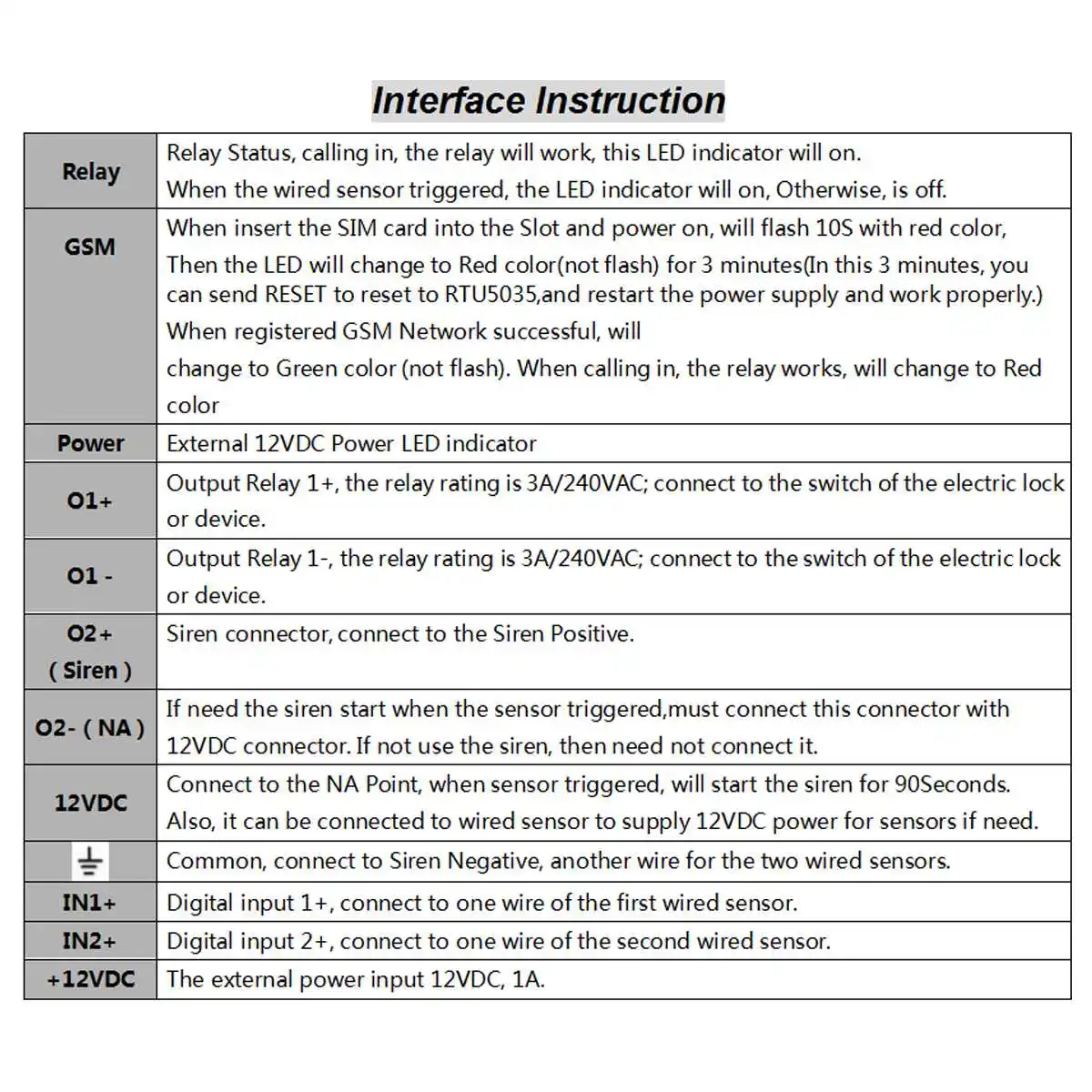 Номинальное напряжение: 12 В постоянного тока 1 А Рабочая температура: от-10 ℃ до + 60 ℃ Температура хранения: от-20 ℃ до + 60 ℃ Относительная влажность: 10-90%, без конденсации Рабочая частота: 900/1800 МГц Протокол связи: GSM PHASE 2/2 + (включая службу передачи данных) Проводные зоны: 2 Сигнал: 2G Связанное напряжение выходного реле: 6A/240V AC Вес: 200 г Размер: 95*66*25 мм/3,74*2,59 * 0.98in