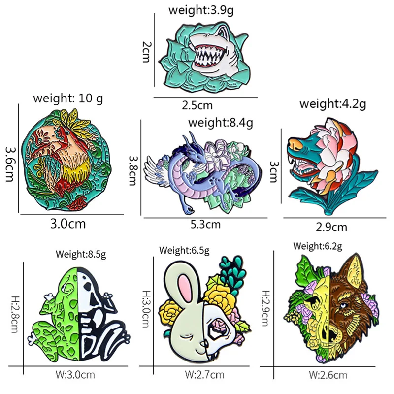 Яркие эмалированные булавки в виде цветов, растений, животных, черепа, скелета, Акула, волк, попугай, дракон, кролик, собака, блестящий Готический значок, ювелирные изделия