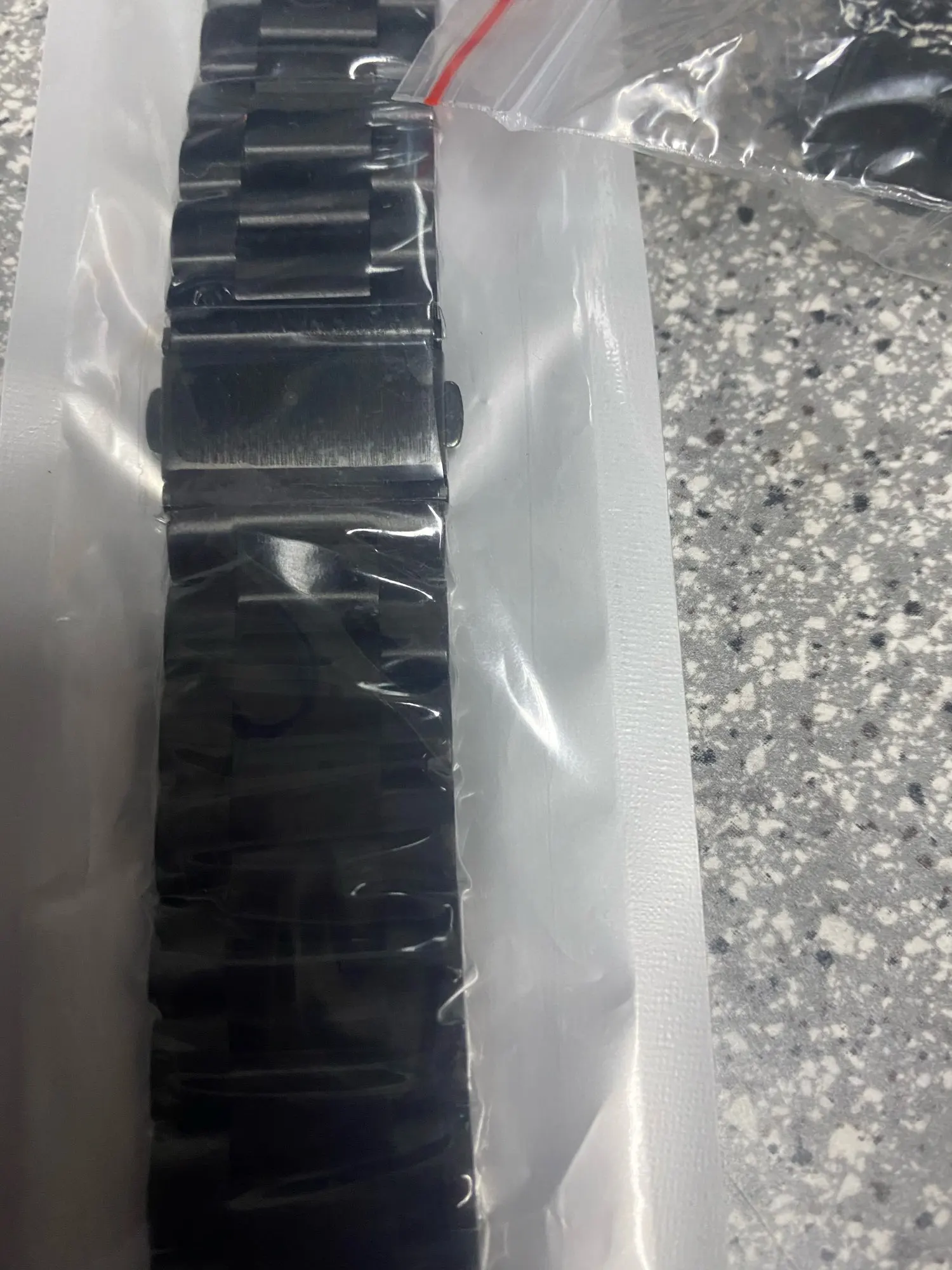 The band had a spot stained in black and it doesn't seem possible to clean it. It also had small scratches and looks and feels like a heavily used product. Overall the product feels very cheap, and looks like it's going to break pretty easily. Also, there's no way to adjust the size.