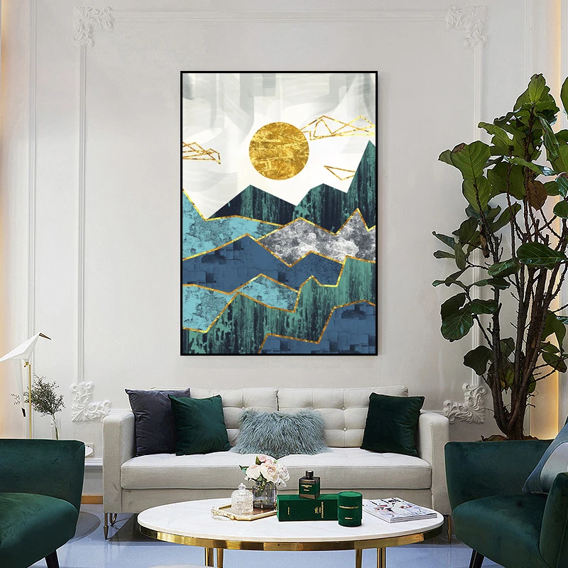 Скандинавский Зеленый пейзаж, живопись, солнце, гора, холст, постер, принты, современные абстрактные картины, настенное искусство, природа, картины, украшение