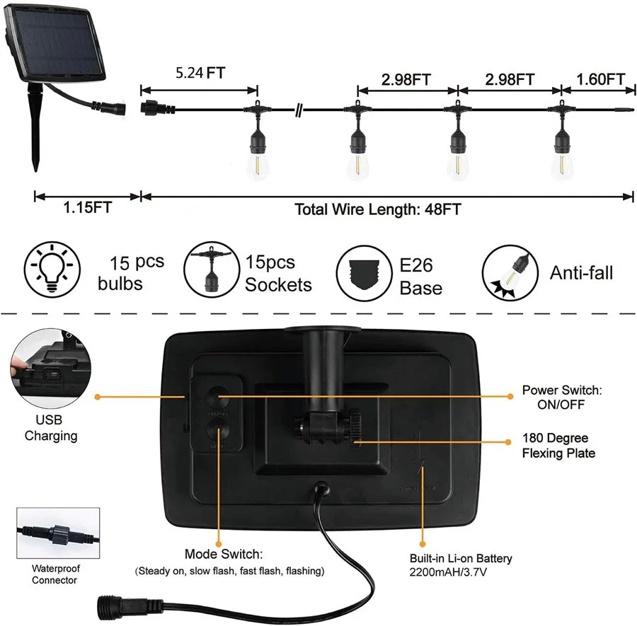 Уличная садовая гирлянда с лампочками S14 на солнечной батарее, подвесной светильник с питанием от солнечной энергии и зарядкой через USB, коммерческого класса, лампочка с круглым светом