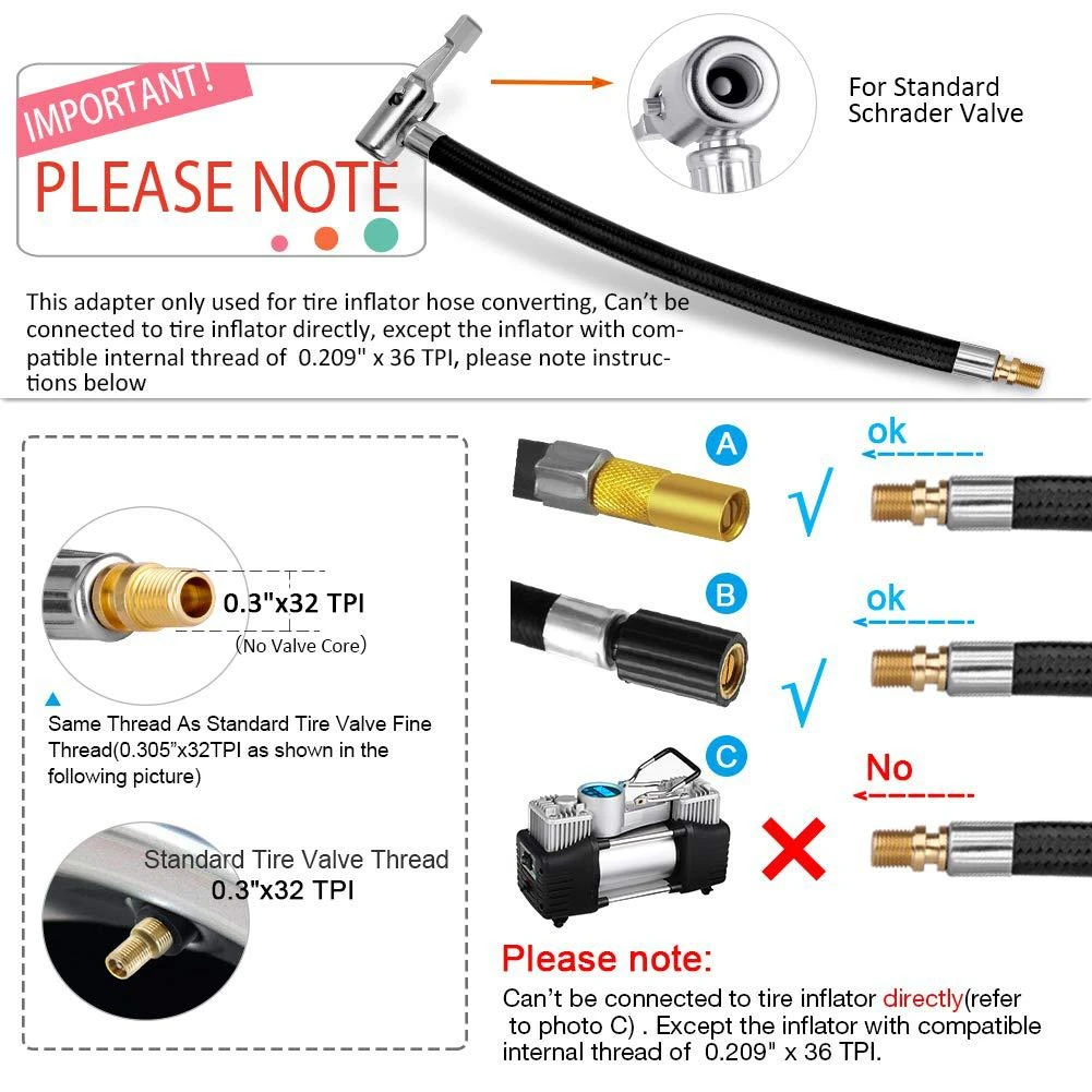 Цельнометаллическая конструкция, портативный патрон для накачки шин, разработан со стандартной тонкой резьбой США для поворотного воздушного патрона, преобразуется в фиксирующее соединение, идеально подходит для заливки воздуха в шины велосипеда, мотоцикла, автомобиля.