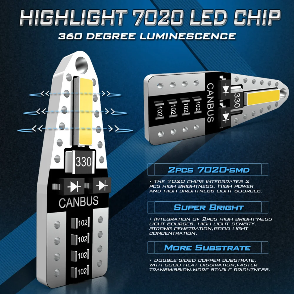● Светильник T10 W5W ●Мощность: 1 Вт ● Тип СВЕТОДИОДА: 2 светодиодных чипа 7020 SMD. ●Цвет света: 6000 К белый ●Рабочее напряжение: DC12V-14V ●Lumen: 100-200 лм/Вт ●Срок службы: более 50000 часов ●Рабочая среда: -40 °C ~ 105 °C