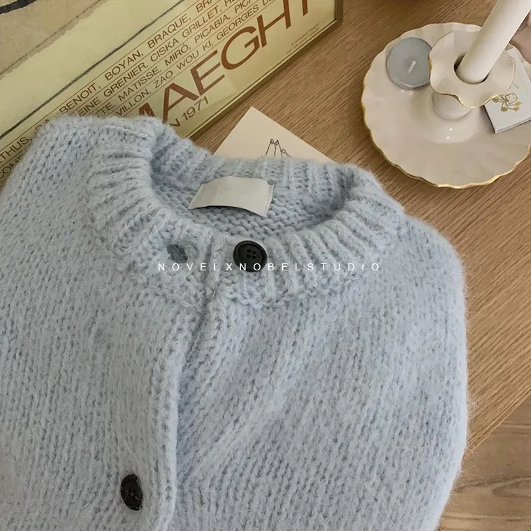 Свитер женский оверсайз с круглым вырезом, винтажный однобортный Кардиган на пуговицах, Свободный кардиган с пышными рукавами, Осень-зима