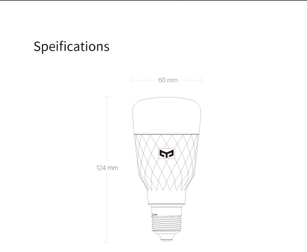 Название: светодиодный светильник Yeelight (цвет)Модель: YLDP05YLРозетка: E27Световой поток: 800 люменЦветовая температура: 1700K-6500KУслуги срок службы: около 25000 часовБеспроводной соединительных: 802,11 b/g/n 2,4 ГГцНоминальная Вход: 100V-240V ~ 50/60HzНоминальная мощность: 10 Вт
