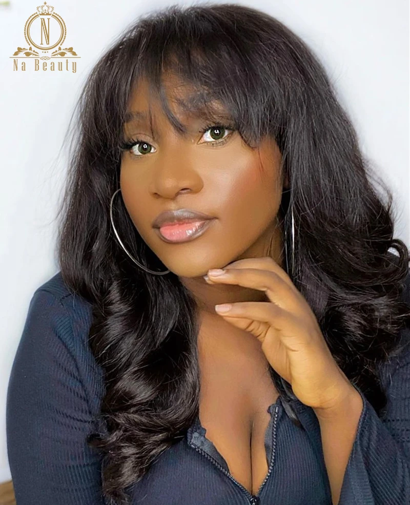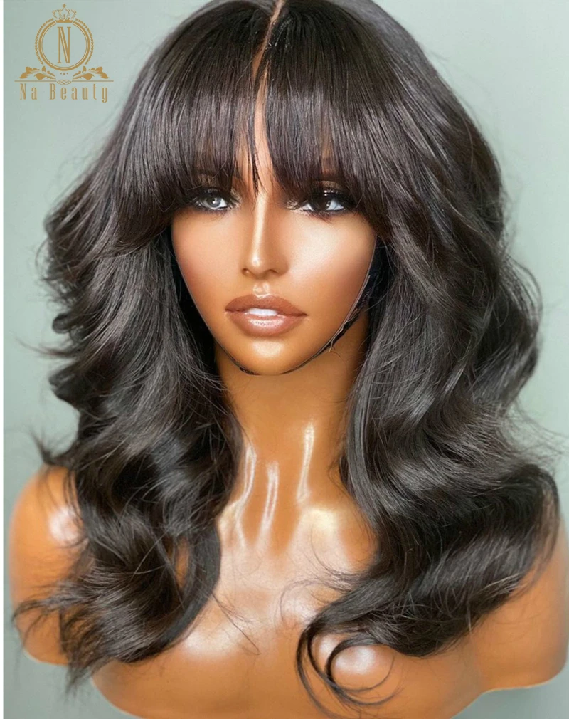 Fringe взрыва парик человеческих волос объемная волна 13x4 кружева фронтальной парик предварительно вырезанные с челкой 150 плотность предварительно передние парики шнурка Nabeauty