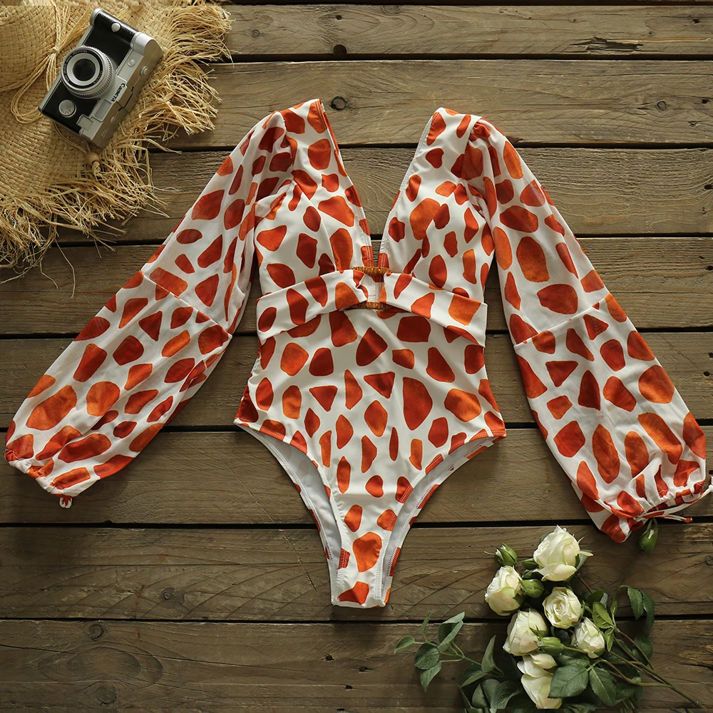 Купальник женский цельный с леопардовым принтом, пикантный купальный костюм с длинным рукавом, пляжная одежда, бикини с высокой талией, 2021