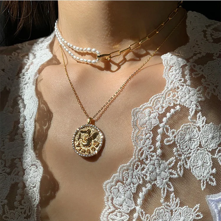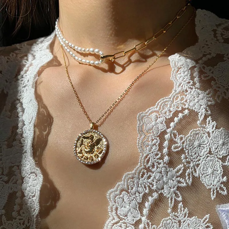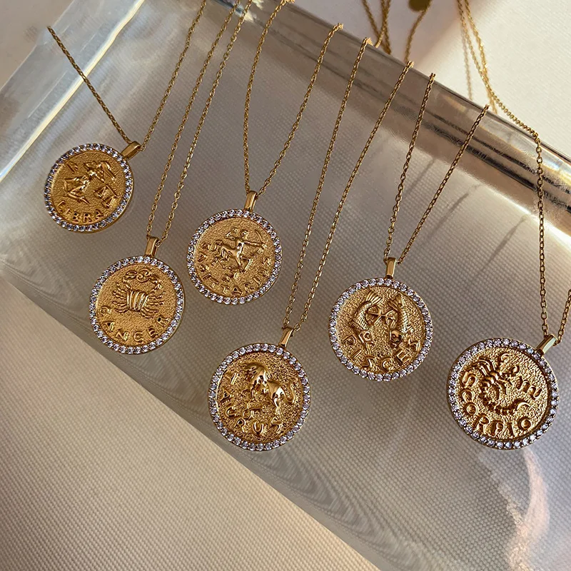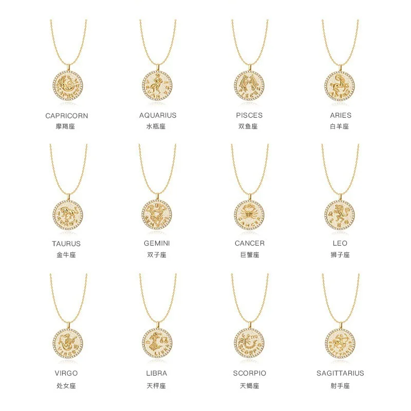 Кубический цирконий зодиака ожерелье для женщин в винтажном стиле; С украшением в виде кристаллов 12 созвездий монета кулон ожерелье Телец Водолей цепи