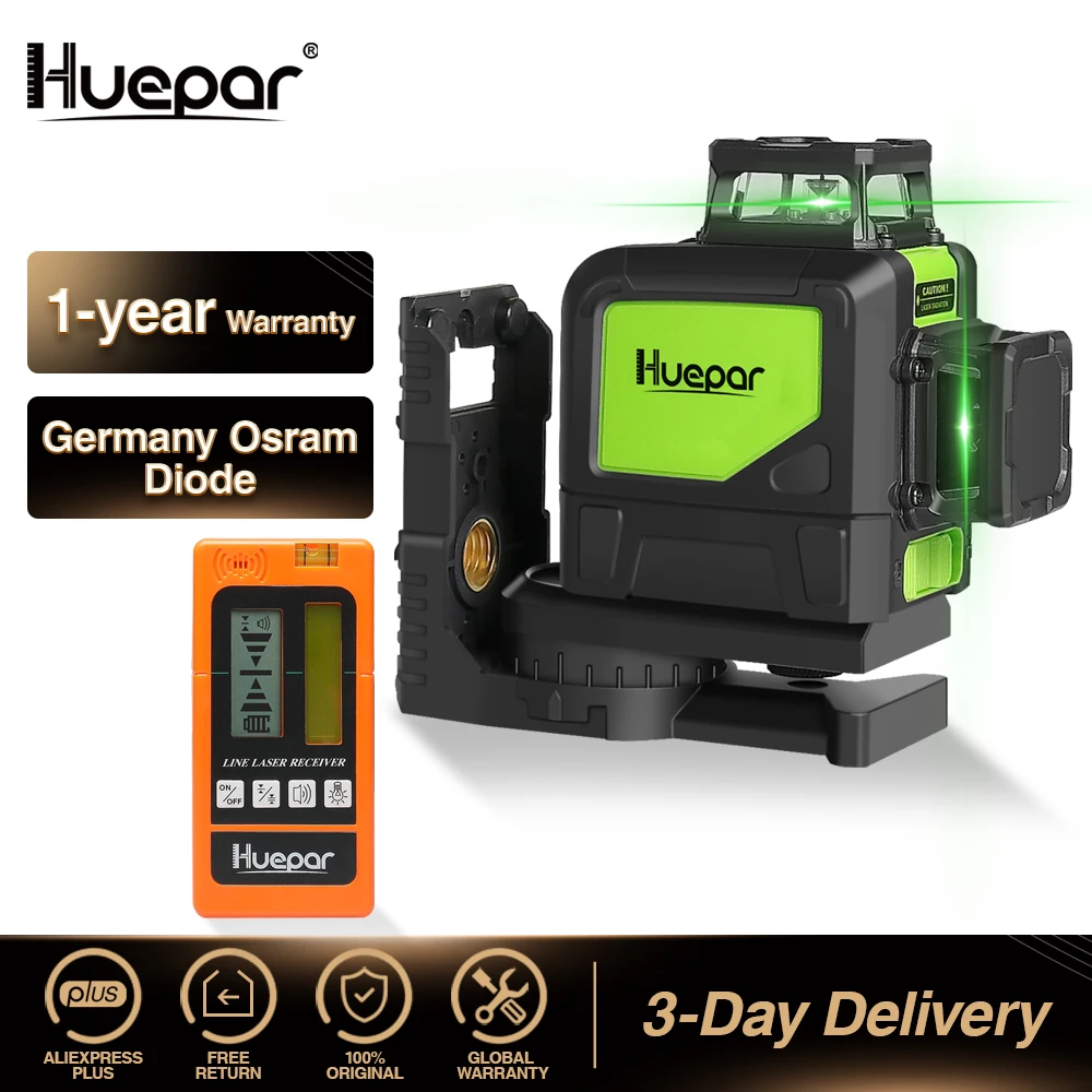 Самонивелирующийся Профессиональный лазер Huepar, зеленый луч, пересечение линий, линия 360 градусов, импульсные режимы + цифровой лазерный приемник Huepar с ЖК-дисплеем