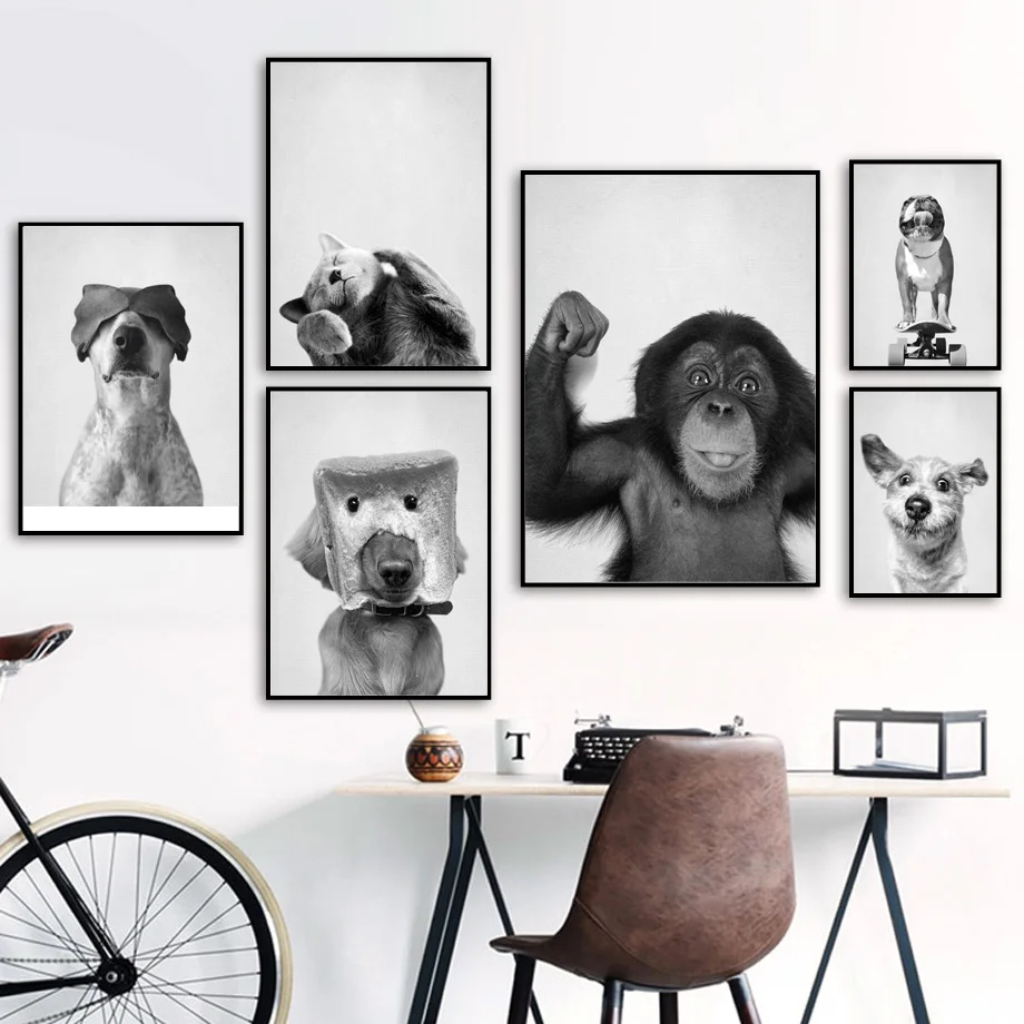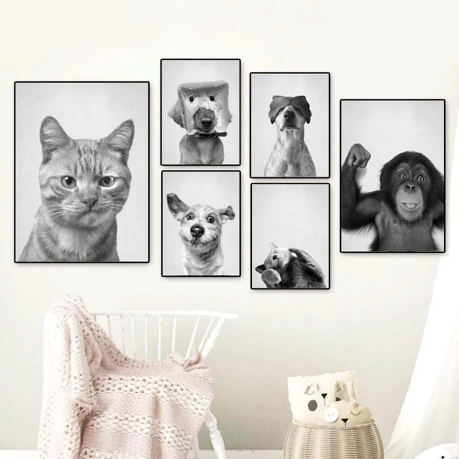 Забавная детская кошка собака смайлик Черно-Белая настенная живопись на холсте скандинавские плакаты и принты настенные картины для декора детской комнаты